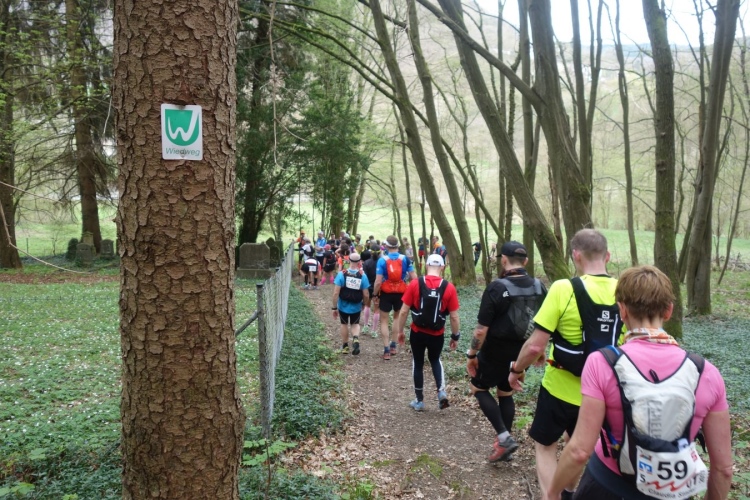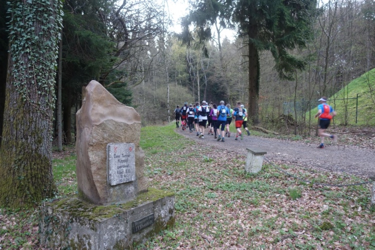 Das Läuferfeld zieht sich immer wieder auseinander, aber Wolfgang „fängt“ alle wieder ein durch regelmäßige kurze Pausen. Auf der Höhe folgt an einem kleinem Friedhof eine solche Pause. Heimatkunde ist angesagt. Wir sind an der Wüstung Rockenfeld. Früher lebten hier 11 Familien und der Ort hatte sogar eine eigene Schule. 1969 wurden die Häuser und Höfe des Ortes abgebrannt. Der Ort Rockenfeld, aus dem die US Milliardärsdynastie der Rockefellers stammt, ist Geschichte.