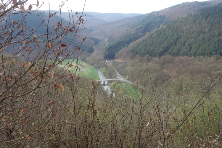 An einem Aussichtspunkt ist wieder eine kurze Rast angesagt und wir haben einen tollen Blick in die Landschaft. Weit unter uns liegt die Brücke über die Wied neben der sich auf einem Wanderparkplatz unsere erste Labestelle befand.