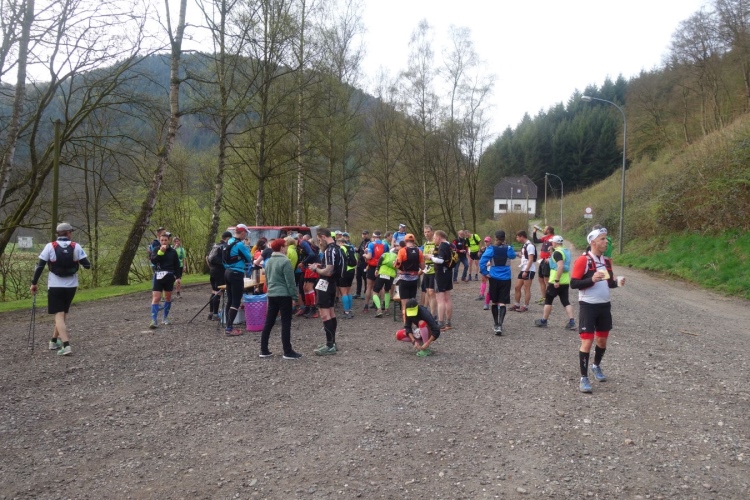 Der kommt in Arnsau auf dem Parkplatz gegenüber der Gaststätte Wiedfriede. Alle freuen sich über die Pause und greifen zu. Es heißt sich nicht nur für die letzten 12,5 Km zu stärken. Uns steht auch noch ein Hammeraufstieg unmittelbar hinter dem VP bevor.