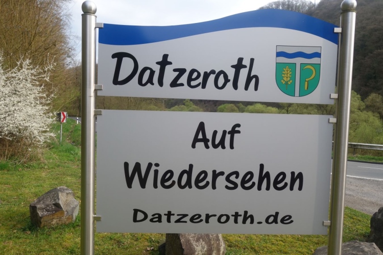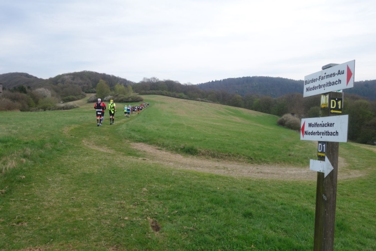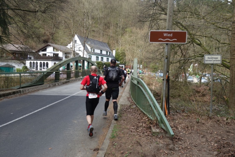 Nach etwa 10 minütiger Pause machen wir uns wieder auf den Weg. Die ersten Läufer verabschieden sich hier. Der Lauf bietet auch die Möglichkeit nur einzelne Etappen zu absolvieren. Über eine Brücke wird die Wied überquert und unmittelbar nach ihr laufen wir noch vor den ersten Häusern von Datzeroth links ab. Wir laufen tatsächlich wenige hundert Meter auf Asphalt. Aber rasch verlassen wir die Wieduferstraße und es heißt rechts hinauf steigen.