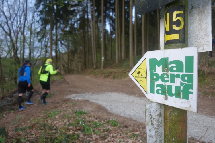 Die Malbergstraße führt uns ansteigend aus dem Ort heraus. Über ein kurzes Wiesenstück laufen wir an den Waldrand wo wir die Strecke des Malberglaufes erst einmal verlassen. Wir laufen geradeaus und steigen weiter an. Der Anstieg wird jedoch gehend absolviert. Das ist heute bei fast allen Anstiegen der Fall.