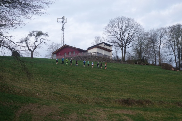 Im Wald stoßen wir wieder auf die Strecke des Malberglaufes. Weiter heißt es Richtung Skihütte zu steigen. Die ersten Läufer entledigen sich diverses Jacken, der Aufstieg läßt die ersten Schweißperlen rinnen. Die K 3 wird überquert und ein letztes kurzes, aber steiles Waldstück vor der Skihütte wird gehend passiert.