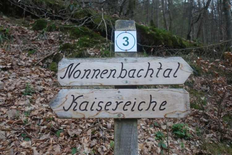 Es ist wunderschön so locker das Nonnenbachtal hinab zu laufen. Es wird weiterhin viel geplaudert. Der Nonnenbach wird gequert und es heißt wieder entlang eines kleinen Bachs zu steigen. Vorbei an einer Basaltkuppe geht es weiter aufwärts.