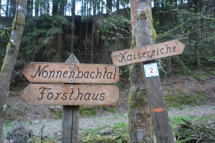 Ein breiter Waldweg nimmt uns wieder auf. Wir laufen auf der Höhe. Gut zwei Stunden sind wir nun schon unterwegs und ein leichtes Hungergefühl macht sich bemerkbar. Gut, dass wir durchs Firnbachtal abwärts Richtung Datzeroth laufen.