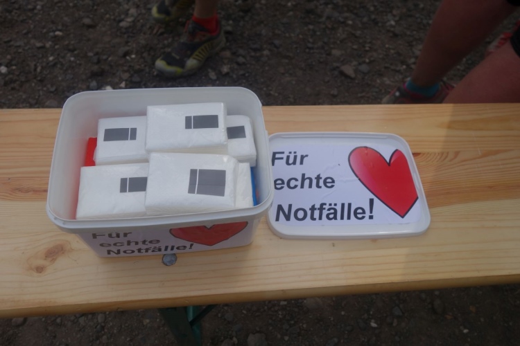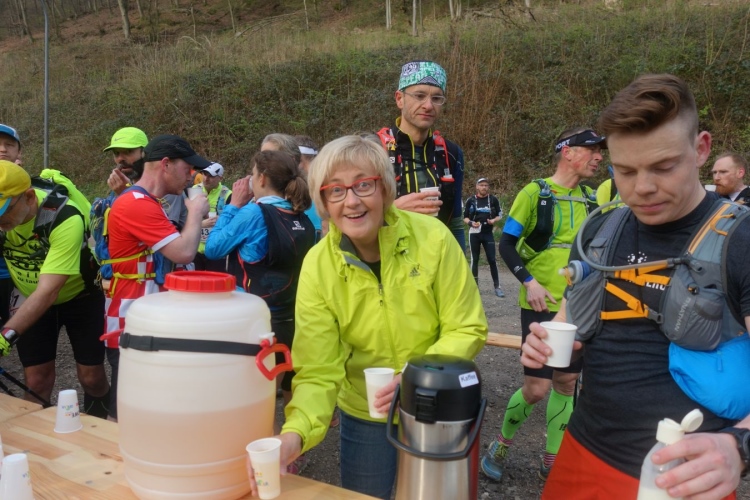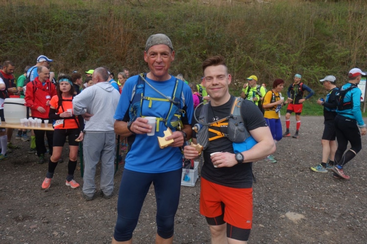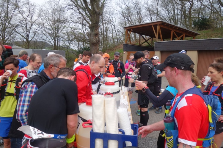 Nach 16 Km und 480 Hm auf- und abwärts wartet der erste Verpflegungspunkt auf uns. Alle sind begeistert. Es gibt Wasser, Iso, Tee und Kaffee zu trinken, Apfel- und Bananenstücke, Käsebrote, Salzstangen, Erdnüsse, Cranberries, Kekse usw. Alle greifen reichlich zu. Mir haben es insbesondere die Cranberries angetan, aber auch den Keksen gegenüber bin ich nicht abgeneigt.