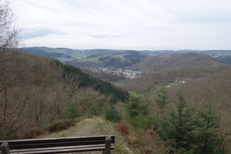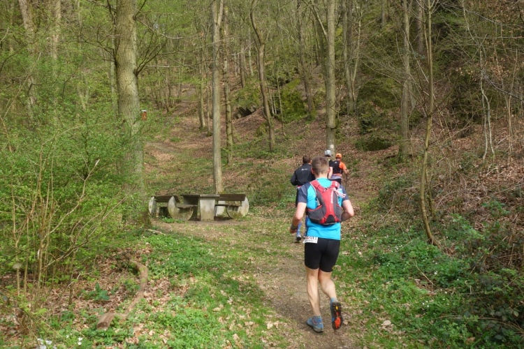 Eine Bank lädt mich zum Verweilen ein. Aber ich muss weiter. Die Strecke führt auf dem Wällerweg weiterhin abwechslungsreich durch den Wald, quert mehrere kleine Wasserläufe, es geht Auf und Ab. Durch das Tal des Hochscheider Bachs kommen wir dem Bärenkopp immer näher. Es geht wieder aufwärts. Puh, das fordert Körner. Aber die Landschaft entschädigt für die Plackerei. Zumal das Tempo in einem Gruppenlauf wie diesem gemächlich ist.