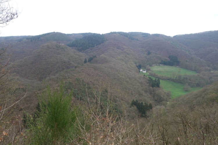 Diese Frage stellt sich mittlerweile nicht nur mir. Wir sind schon fast vier Stunden unterwegs und es meldet sich wieder ein kleiner Hunger. Erst einmal laufen wir am Ackerhof vorbei. Zwei Pferde stehen draußen auf der Koppel und sind wenig an uns Läufern interessiert. Im Wald kommen wir an einen Aussichtspunkt. Am Hang gegenüber können wir die Neuerburg erkennen und den Hof an dem wir in den Wiesenweg zur Gedenkkapelle eingebogen sind.