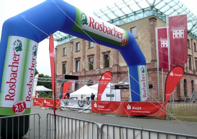 Und dann die Krönung. Ganz scharf rechts. Steilst aufwärts. Gras und Matsch. Einspurig. Oben dann Asphalt, bergauf aber weiter. Im Ziel startet gerade eine Bikertruppe, der einsame Läufer fällt überhaupt nicht mehr auf. Hier ist man schon mit den nächsten Wettbewerben beschäftigt.