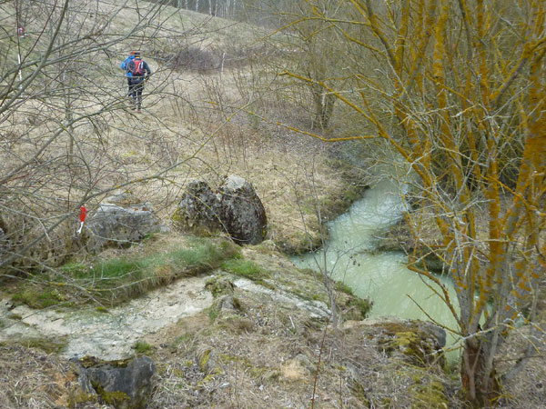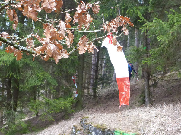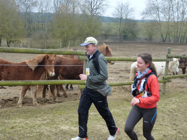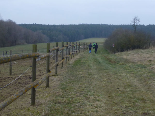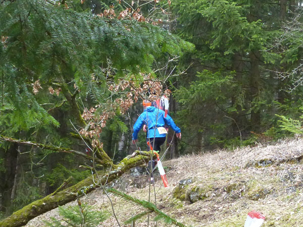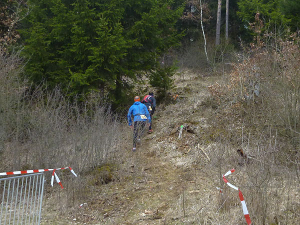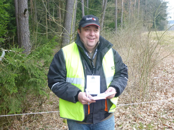 An Pferdekoppeln vorbei führt der Weg – ja, ja, tatsächlich so etwas wie ein Weg – wieder abwärts in den Forst, wo wir mit mehreren steilen Auf- und Abstiegen belohnt werden. Beim Verlassen des Waldstückes steht Streckenposten Toni. Er hat auch einen Notizblock gezückt und notiert alle die diesen Abschnitt ordnungsgemäß bewältigen.