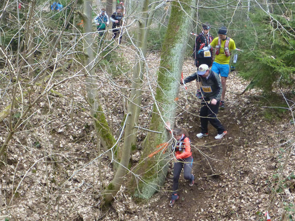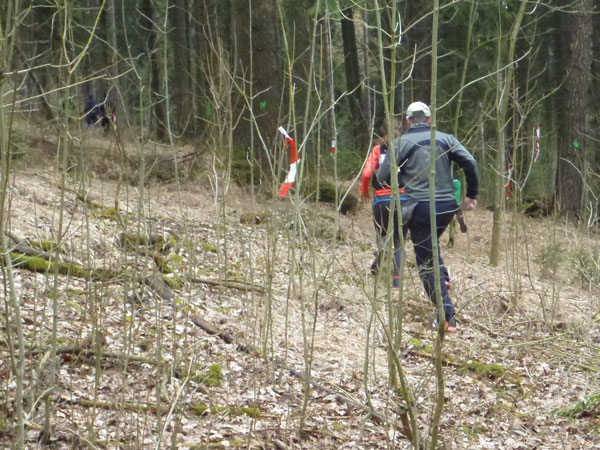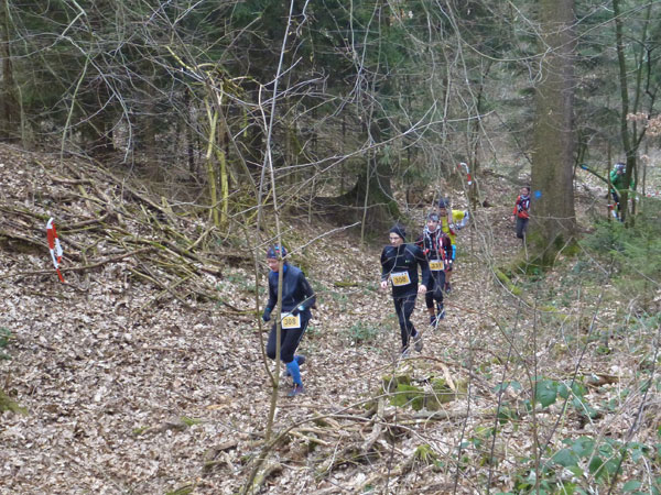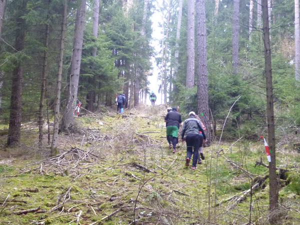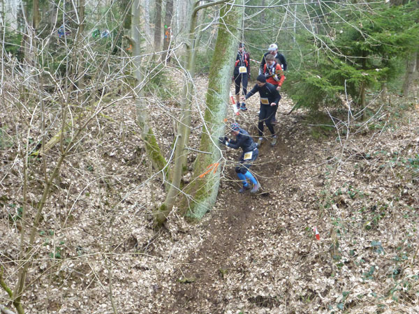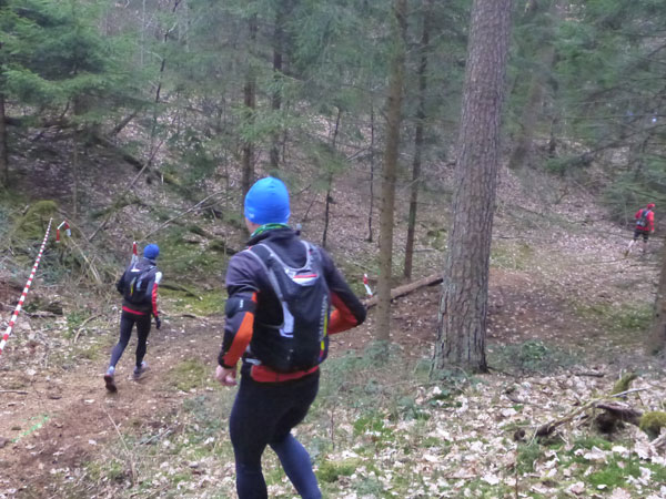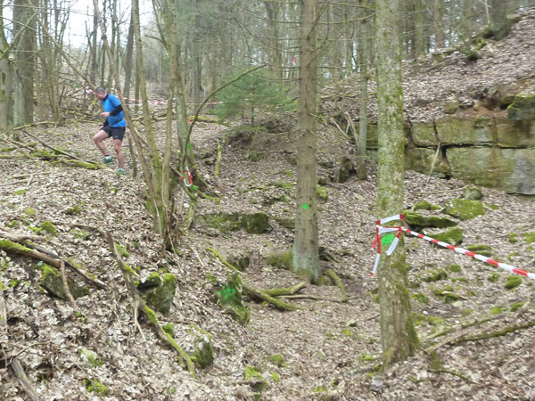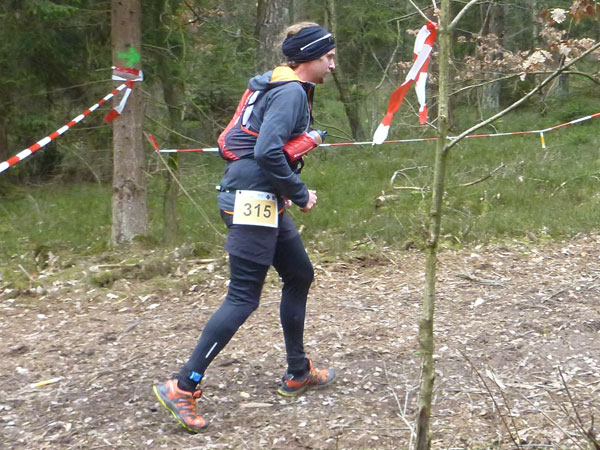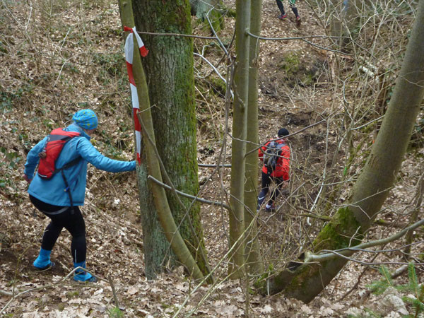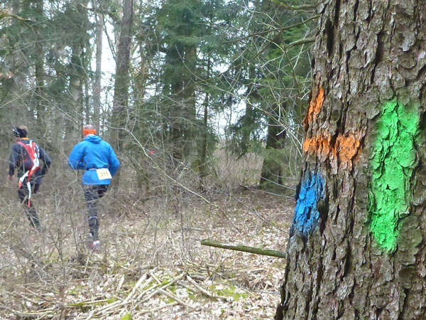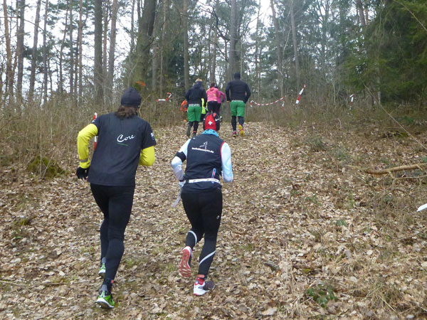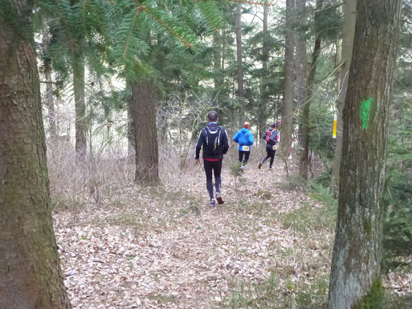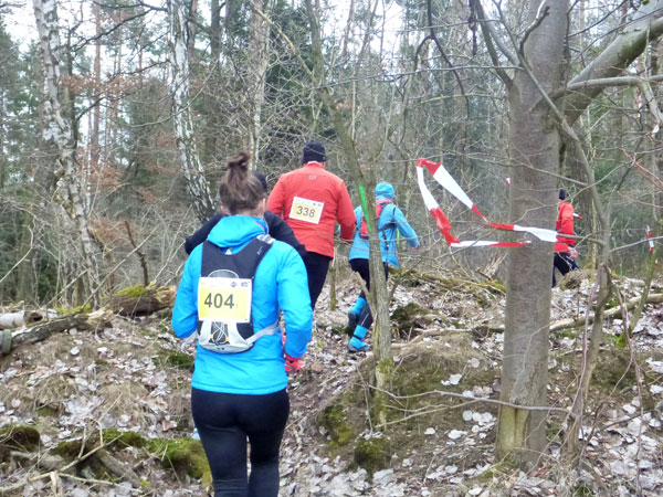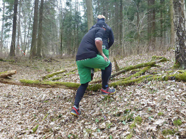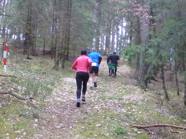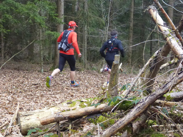 Nach ca. einem Kilometer verschwinden wir für eine erste Schleife durch den Forst, wo auch schon ein erstes Schlammloch auf uns wartet. Im Übrigen eines der ganz wenigen des heutigen Tages, kann ich schon mal vorausschicken. Der wilde Wald – auf Wegen laufen wir ja nicht – präsentiert sich von seiner allerbesten Seite. Es gibt nach unserem superlangen Winter keine Schneereste mehr zu sehen und die kalten und trockenen Tage zuvor bescheren uns einen idealen Untergrund.