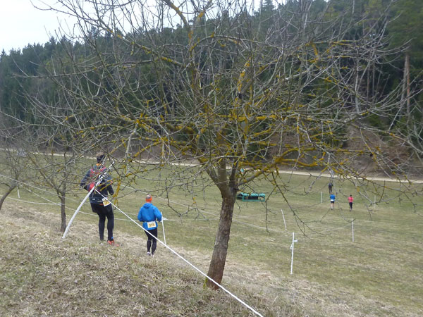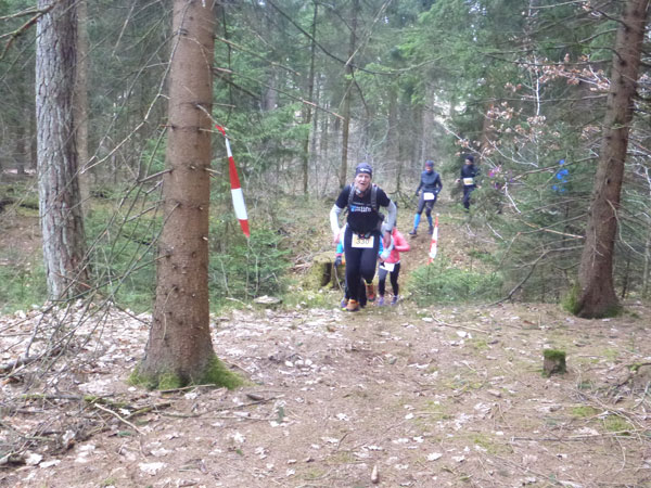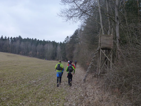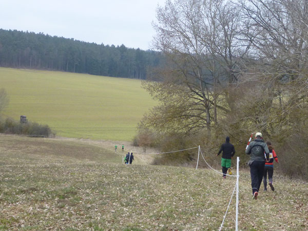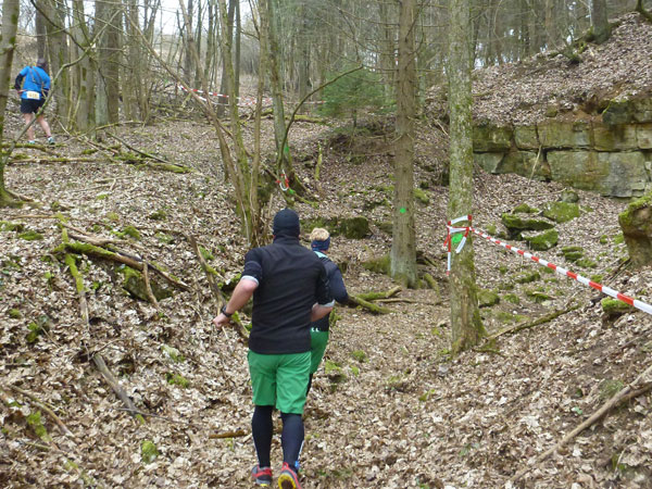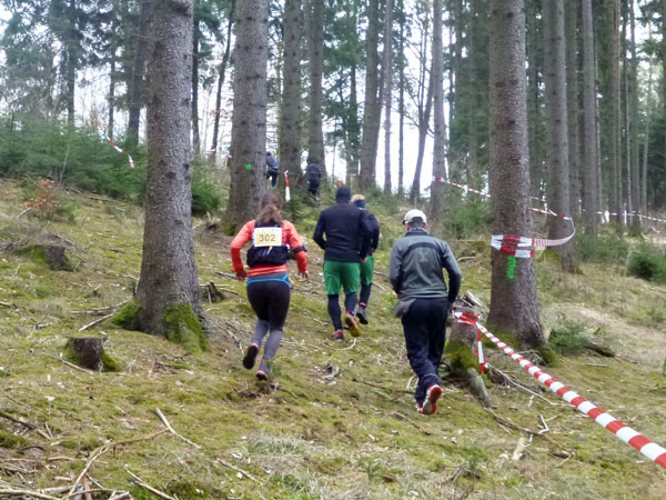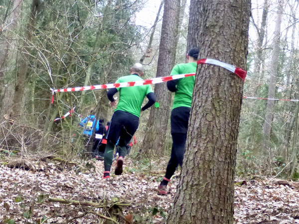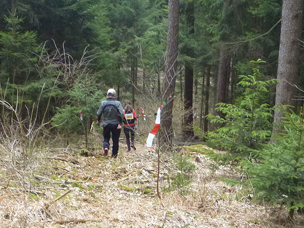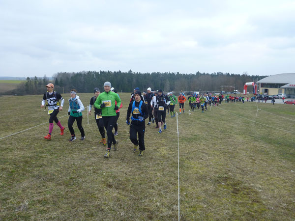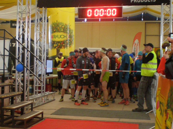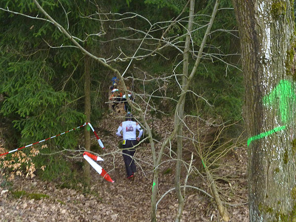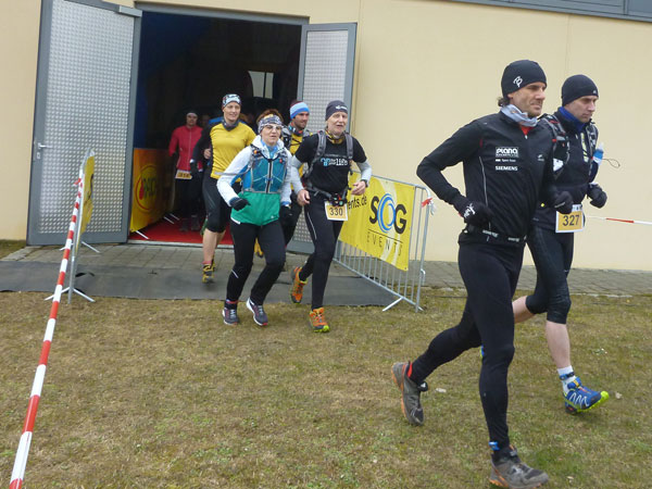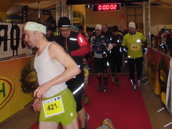 DUOs und TRIOs gehen gemeinsam um 12 Uhr an den Start. Neben den Dreierteams starten noch 50 Zweiermannschaften, so ist vor dem Startbogen einiges los. Der aus Funk und Fernsehen bekannte Moderator Peter Maisenbacher schickt uns auf die Strecke. Im diffusen Licht geht es über eine roten Teppich mit einigen Stufen versehen nach draußen. Dass wir heute keinen flachen Waldlauf vor uns haben, konnten wir schon bei der Anreise vergegenwärtigen. Bereits die ersten Freiluftmeter über die angrenzenden Wiesen bringen die Erinnerung bei mir freudig zurück. Ein Höhenprofil gab es vorab nämlich nicht zu studieren und dass es so hügelig ist, hätte ich auch nicht zu träumen gewagt. Mich freut’s natürlich umso mehr, dass zu den Naturpfaden noch viele Höhenunterschiede kommen, das macht doch erst das Salz in der Suppe aus.