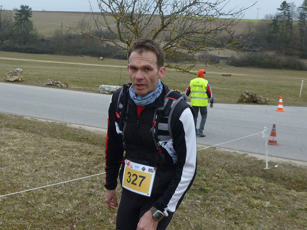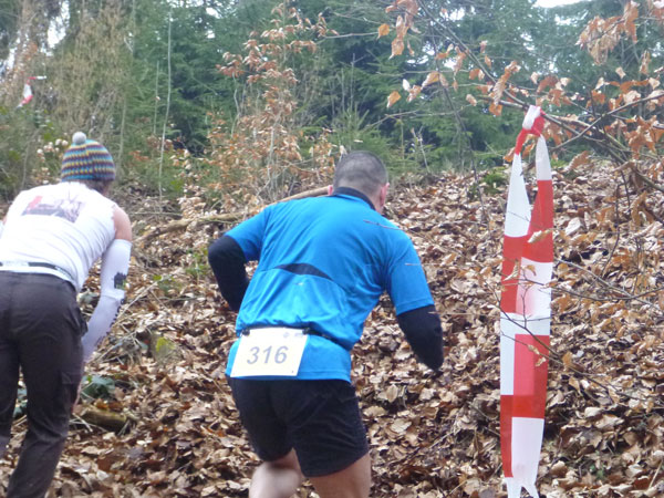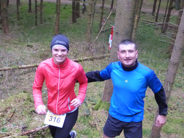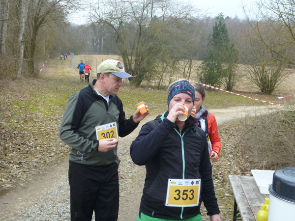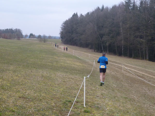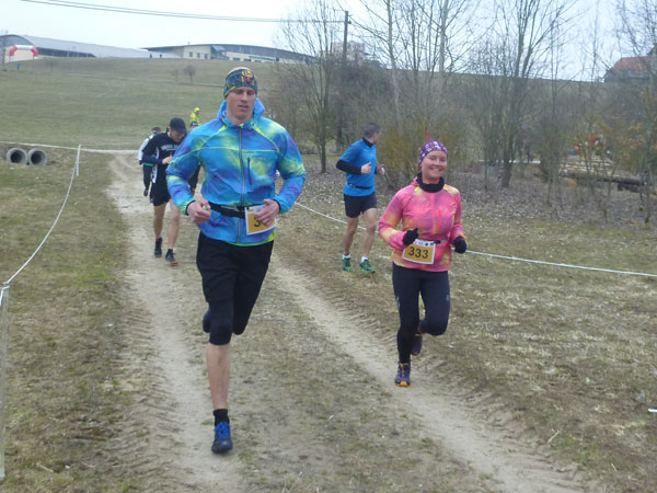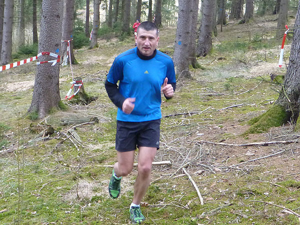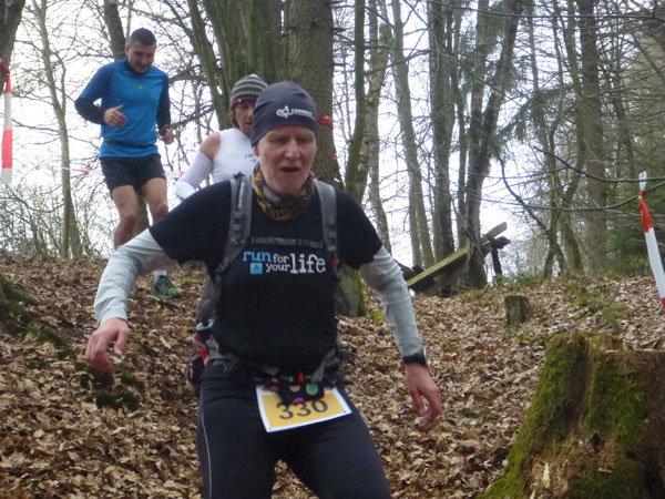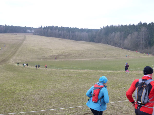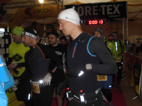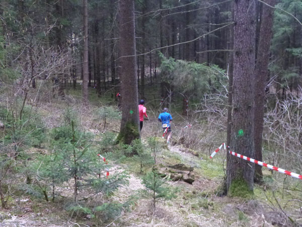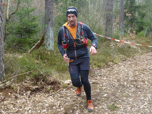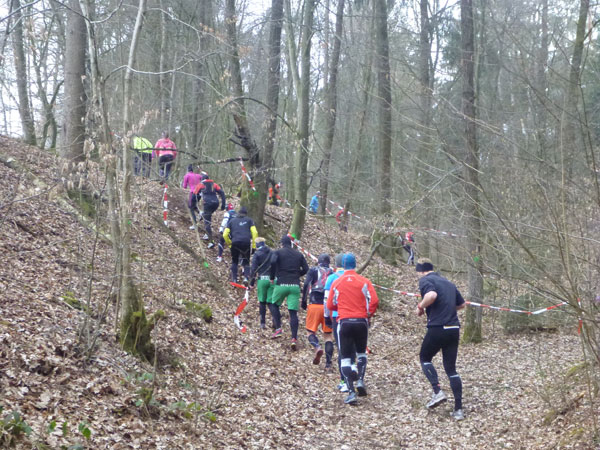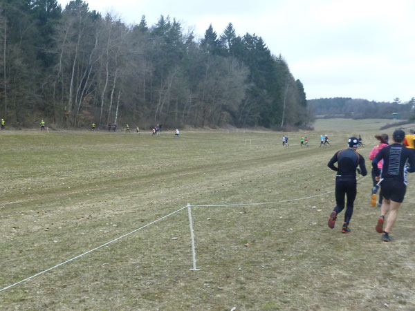 DUOs und TRIOs gehen gemeinsam um 12 Uhr an den Start. Neben den Dreierteams starten noch 50 Zweiermannschaften, so ist vor dem Startbogen einiges los. Der aus Funk und Fernsehen bekannte Moderator Peter Maisenbacher schickt uns auf die Strecke. Im diffusen Licht geht es über eine roten Teppich mit einigen Stufen versehen nach draußen. Dass wir heute keinen flachen Waldlauf vor uns haben, konnten wir schon bei der Anreise vergegenwärtigen. Bereits die ersten Freiluftmeter über die angrenzenden Wiesen bringen die Erinnerung bei mir freudig zurück. Ein Höhenprofil gab es vorab nämlich nicht zu studieren und dass es so hügelig ist, hätte ich auch nicht zu träumen gewagt. Mich freut’s natürlich umso mehr, dass zu den Naturpfaden noch viele Höhenunterschiede kommen, das macht doch erst das Salz in der Suppe aus.