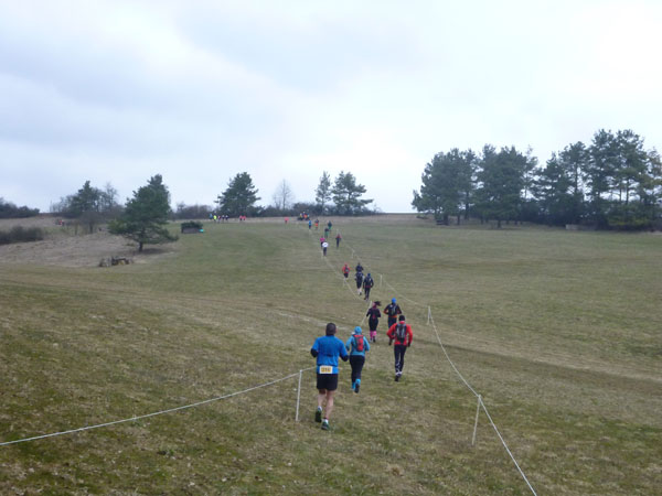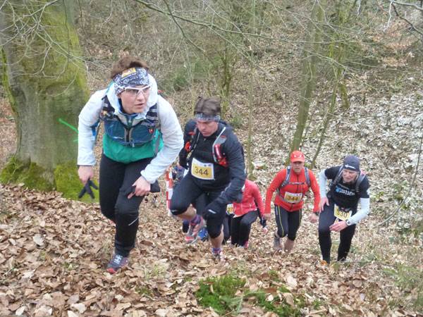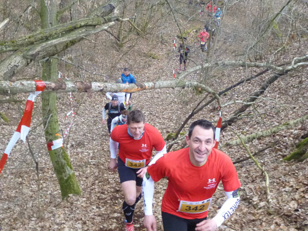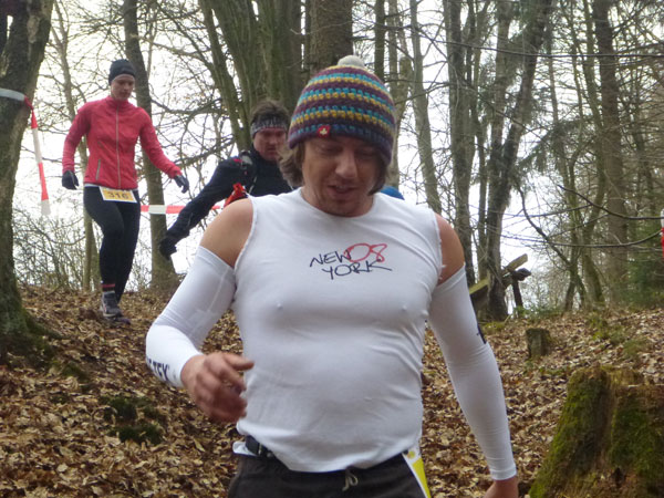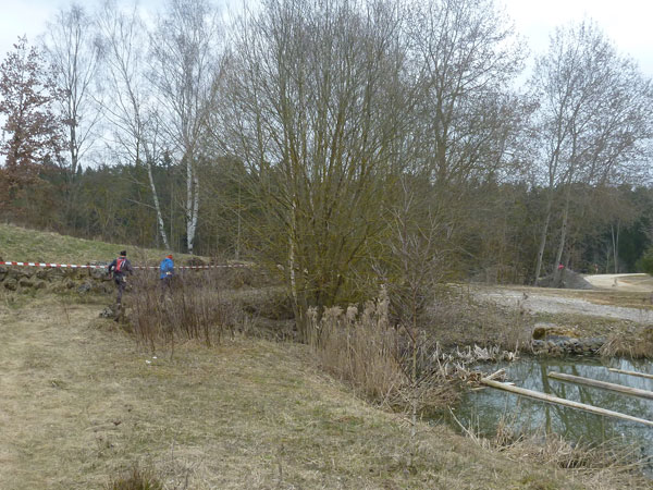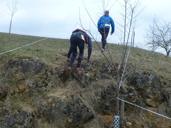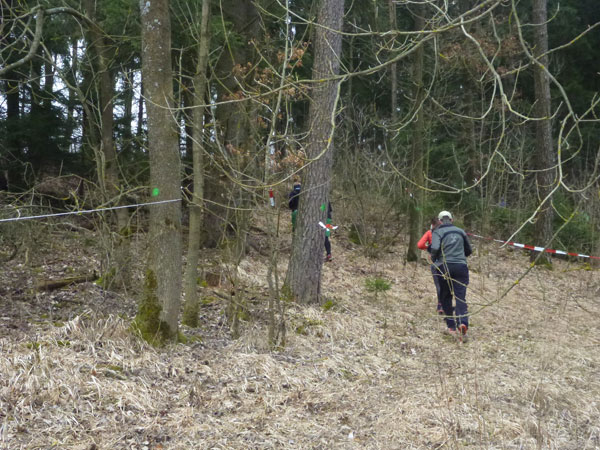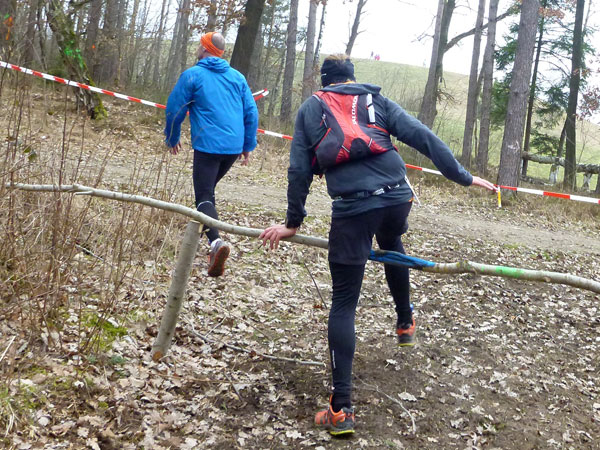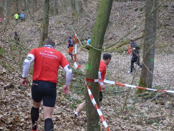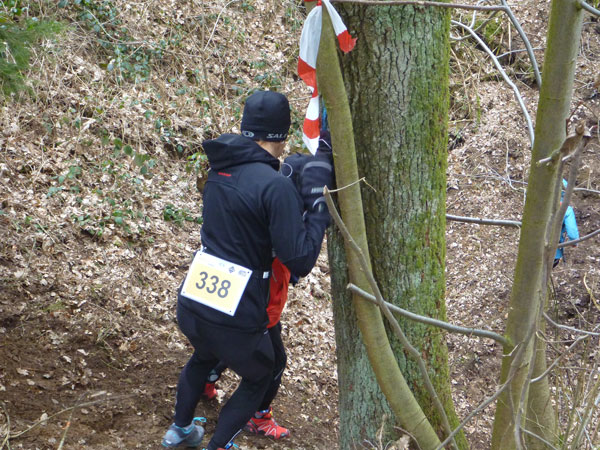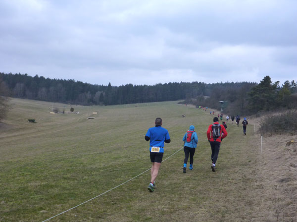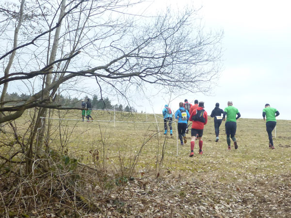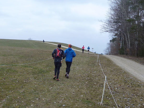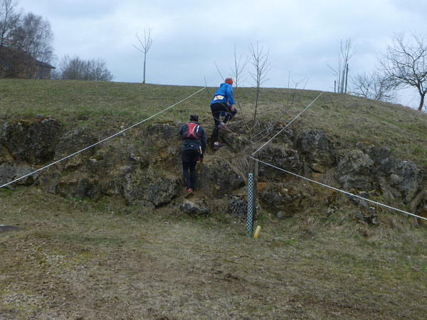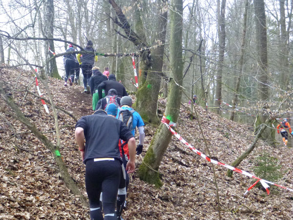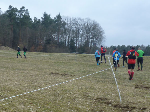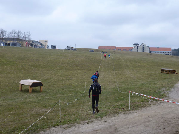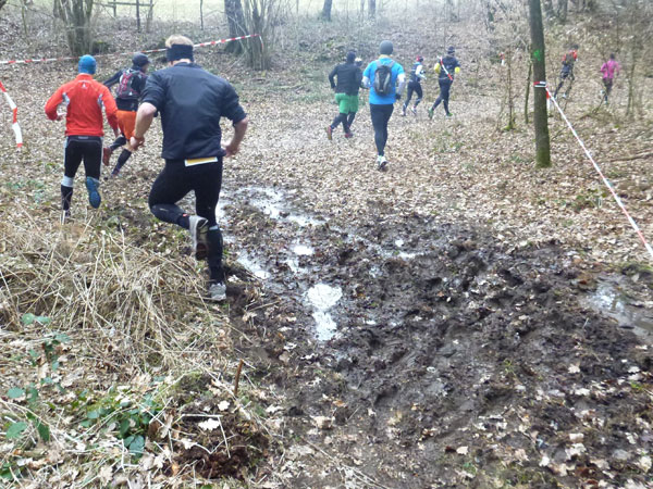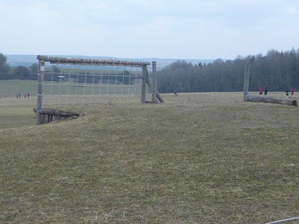 Etwa zwei Kilometer ziehen sich die ersten Windungen durch’s Unterholz, dann geht’s wieder raus auf eine große Wiese. Kupiert, aber meist überwiegend bergauf passieren wir diverse Hindernisse des Spielplatzes des „No Guts no Glory“ Hindernisrennens. „Braveheart“ Joe hätte hier bestimmt seine wahre Freude, es gibt auch ein erfrischendes Wasserloch im Februar zu durchqueren. Am höchsten Punkt unserer Runde ziehen wir auf freiem Feld an „NetWall“ vorbei. Uns erspart man aber diese Klettereinlage, wir sind ja auch nur einfache Trailer, keine Krieger. Im Teilnehmerfeld befinden sich aber schon ein paar Helden dieser Veranstaltung, stolz präsentieren sie ihre Finishershirts. Der zwei Kilometer lange Aufstieg am Rande der Wiesenfläche ist nicht sonderlich steil, läppert sich aber doch auf 100 Höhenmeter zusammen. Die Downhill-Passage mitten durch die Grünfläche führt uns wieder hinunter und in den Wald.