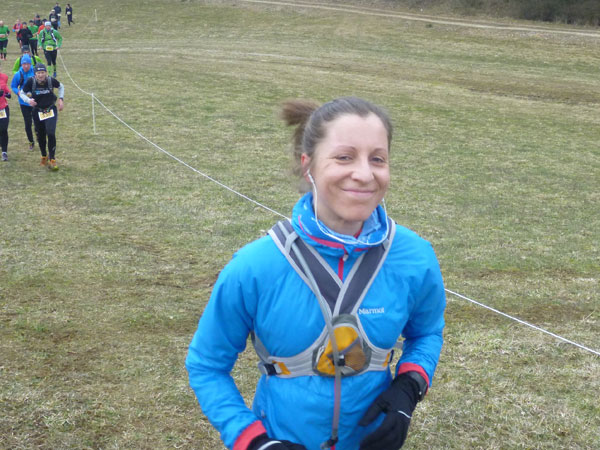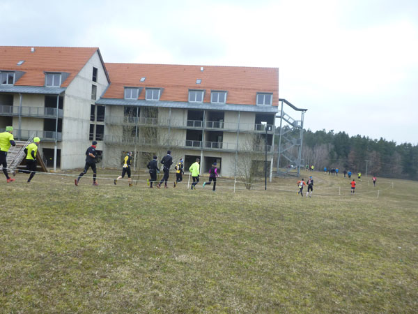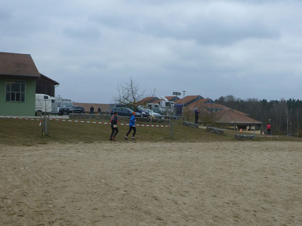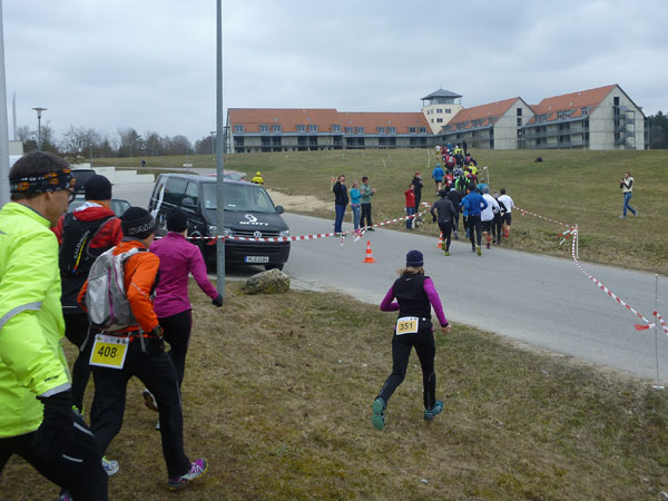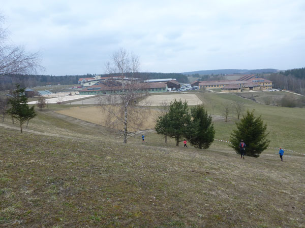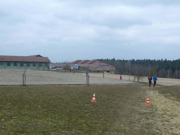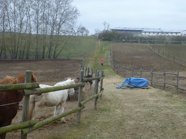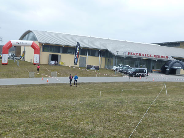 Ein Anstieg bringt uns auf eine Anhöhe mit wunderbarer Übersicht auf das ganze Gelände des Ostbayerischen Pferdesport- und Turnierzentrums. Zwischen Reitplätzen führt unser Weg fast bis an die großen Hallen heran. Trailmaster Julia hat sich hier postiert und feuert mich an. Dabei hat den größten Beifall doch eigentlich sie verdient, hat uns schließlich dieses Strecken-Vergnügen beschert. Noch ist meine erste Runde nicht beendet. Bevor es durch den Nebeneingang in die Festhalle Rieden geht, dürfen wir nochmals eine 1 km lange Schleife weg von den Gebäuden und über den Hang eines angrenzenden Wäldchens drehen.