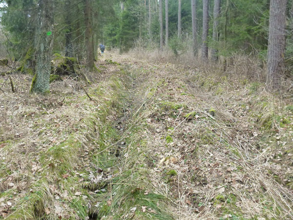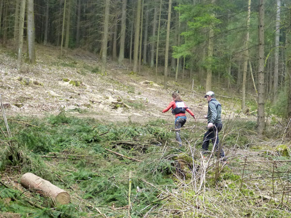 Hier bekommen wir wieder alles was wir Geländefans so lieben. Gibt es irgendwo eine Vertiefung, führt natürlich unser Weg mitten durch. Steigungen werden alle gerne gesehen und natürlich mitgenommen. Gestrüpp, quer liegende Stämme, Holzzäune und kleinere Felswände zum überklettern, alles gerade recht für uns. Einfach herrlich, so muss Trail sein. Gar nicht so einfach ist es hier für mich immer auf Anhieb den richtigen Weg durch den wirklich wilden Wald einzuschlagen, aber irgendwie klappt’s am Ende doch und ich denke, ich war immer auf der richtigen Spur.