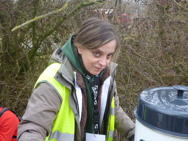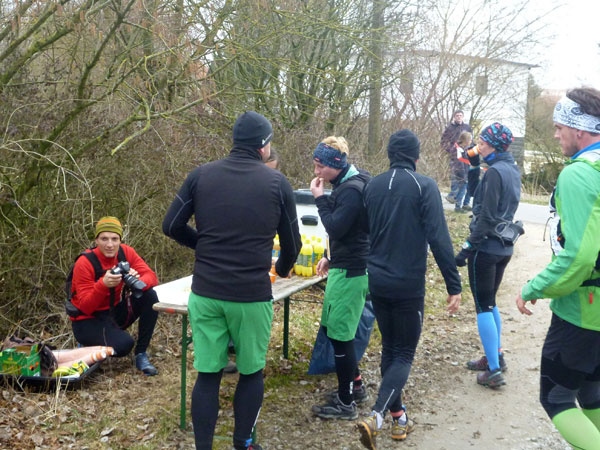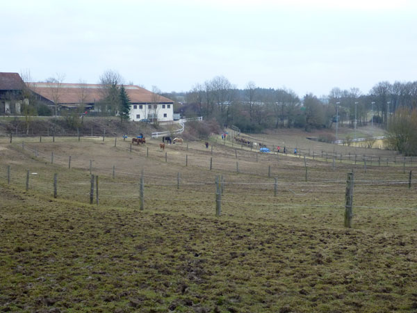 Etwa zur Halbzeit der Runde ist eine Getränkestation aufgebaut. Das warme Isogetränk trifft bei den wenigen Plusgraden genau meinen Geschmack. Eine Runde entspricht im Prinzip einer Umrundung von Gut Matheshof gegen den Urzeigersinn, natürlich verbunden mit vielen Windungen, Schleifen und sexy Kurven. Den nördlichen Abschnitt haben wir hier hinter uns und befinden uns seitlich dieses riesigen Anwesens.