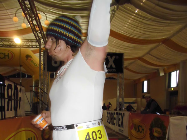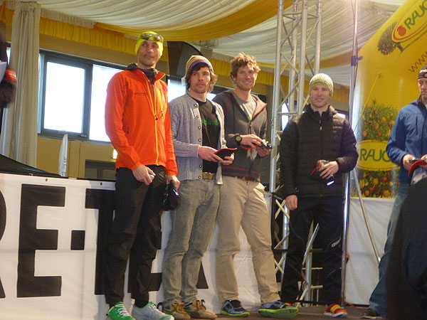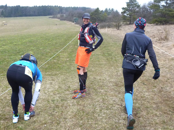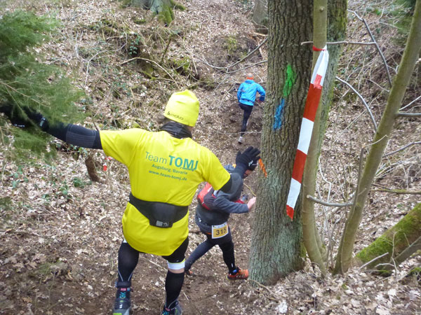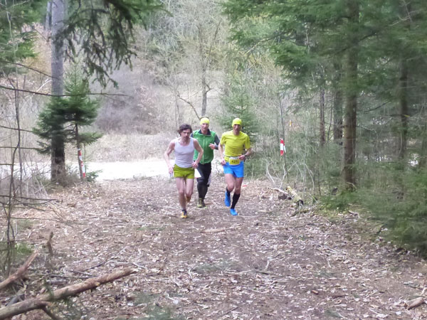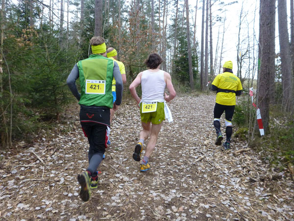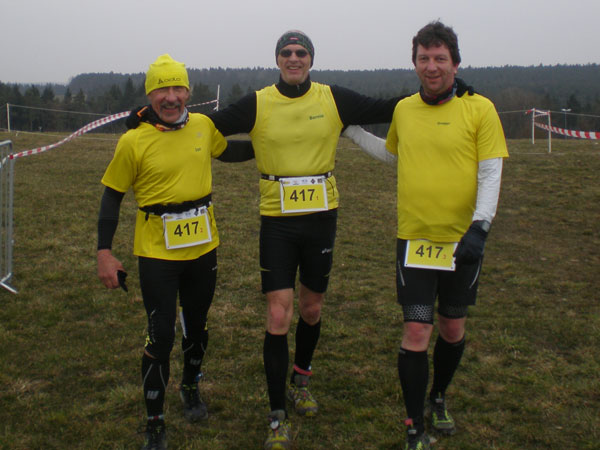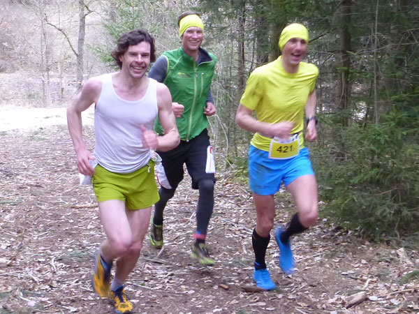 Nach ziemlich genau 3 Stunden werden wir vom Führenden Trio eingeholt. Matthias Dippacher und seine Partner vom Team Allgäu preschen an uns vorbei. Er hat es heute nicht einmal nötig, richtige Profilschuhe aufzuziehen. Mit gewöhnlichen Straßenlaufschuhen fliegt er über die Trails. Für unsereins aber nicht unbedingt empfehlens- und nachahmenswert bei dem weichen Untergrund. Wobei es für mich durchaus nachvollziehbar ist, er trägt nämlich auch einen meiner Lieblingsschlappen.