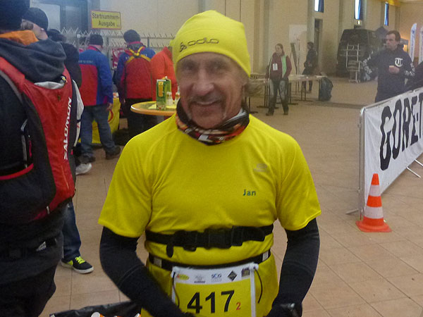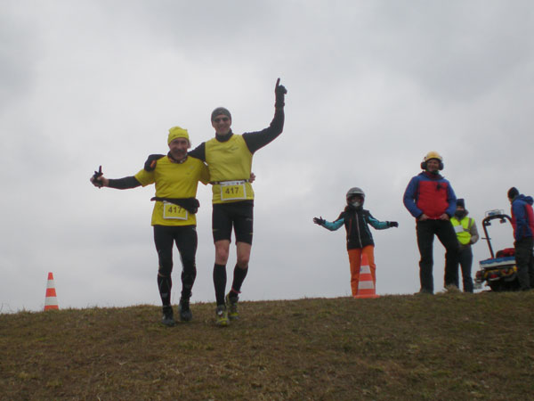 Auf der Anhöhe stehen noch immer die durchgefrorenen Streckenposten von SOG Events. Sind wahrlich nicht zu beneiden, aber dennoch immer freundlich und gut drauf. Danke für euren Einsatz. Das obligatorische Gipfelfoto nehmen wir wieder freudig an. Das Ziel liegt hier schon im Blickfeld, aber ein paar kurze Klettereinsätze gibt es bis dahin noch zu bewältigen.