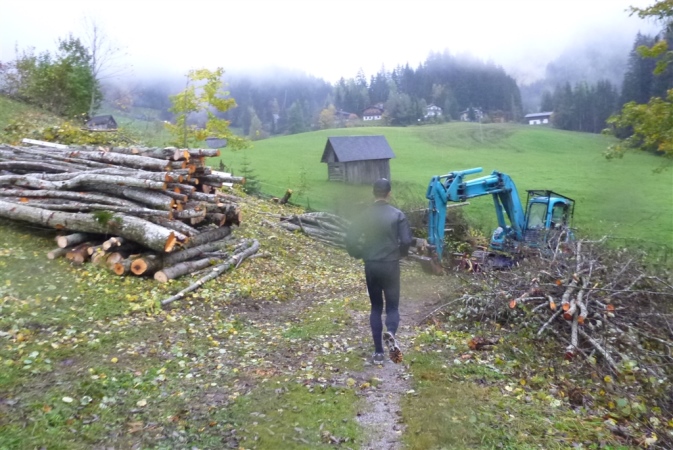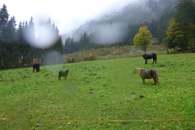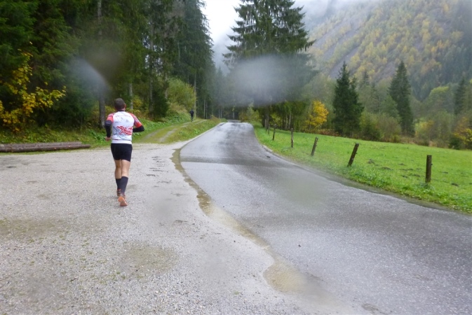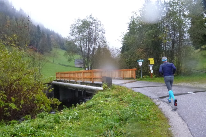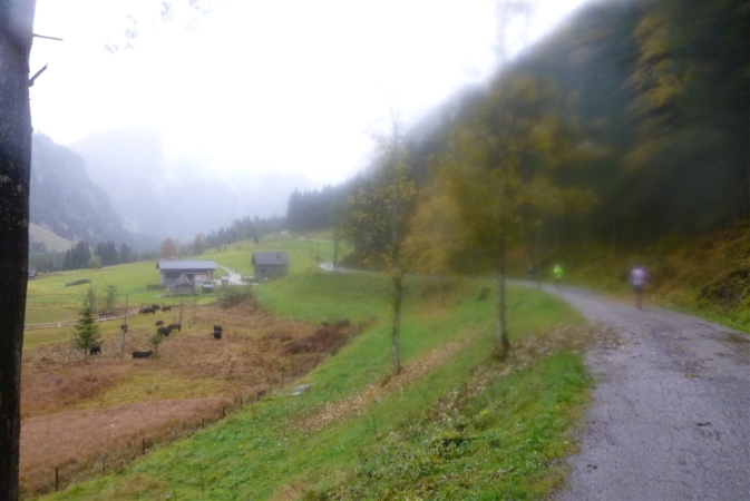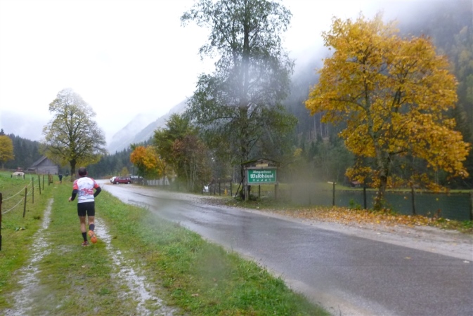 Zügig komme ich voran, schon bald ist das Untertal mit der gleichnamigen Ortschaft erreicht. An einigen Häusern haben sich tatsächlich ein paar unentwegte Fans eingefunden, denen dafür umso mehr Dank gebührt, denn so schön ist es nicht, im kalten Regen auszuharren. An der Gföllermühle vorbei, der letzten von einstmals 40 im Untertal, geht es weiter bergwärts. Das zu durchquerende Naturschutzgebiet Toteisboden ist ein vor 10.000 Jahren entstandenes Naturphänomen: Nachdem Felsstürze auf Gletschereis gefallen waren, schmolz das darunterliegende Eis ab. Es entstanden komplexe Kanal- und Belüftungssysteme, die während des ganzen Jahres annähernd stabile Temperaturen erzeugen – weshalb sich die ausströmende Luft im Sommer kühl und im Winter warm anfühlt. Das Ergebnis ist eine einzigartige Flora, die wir im Vorbeihuschen bewundern dürfen.