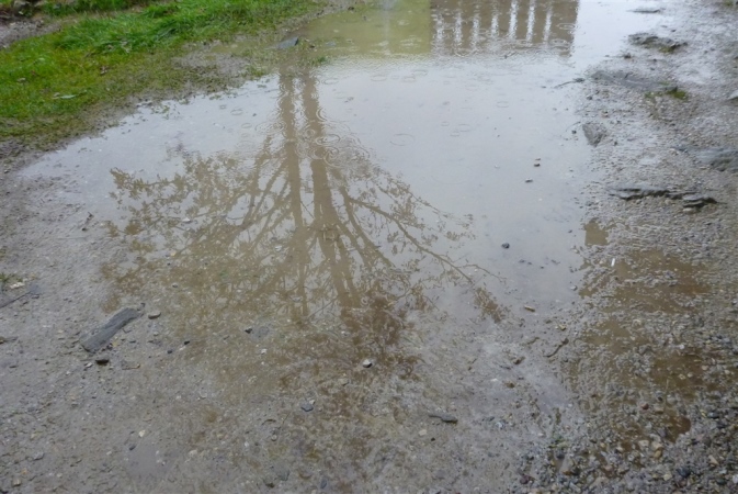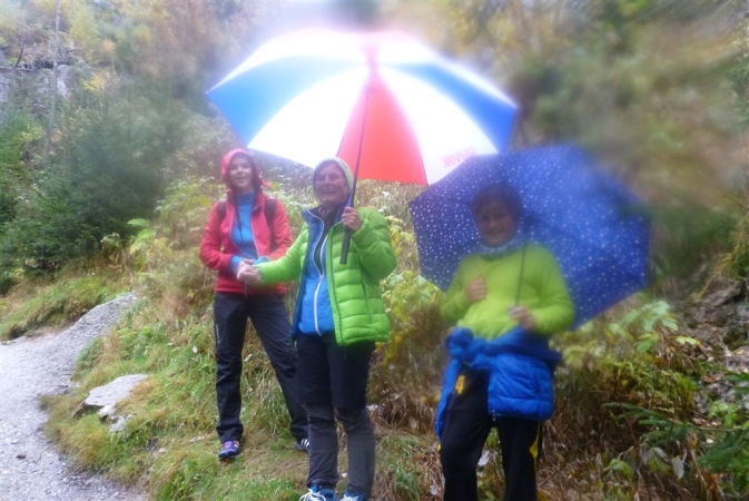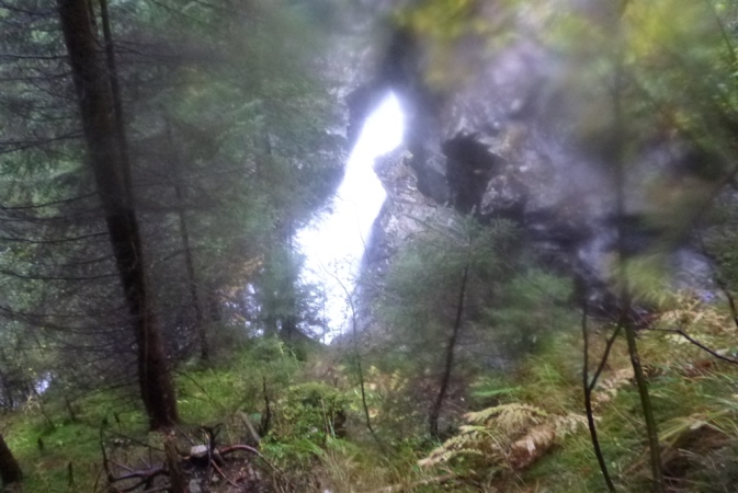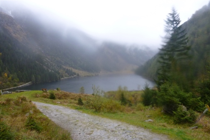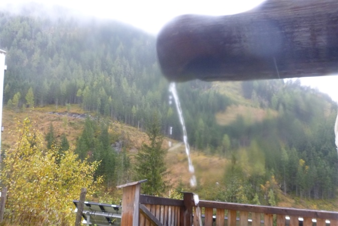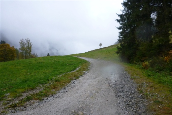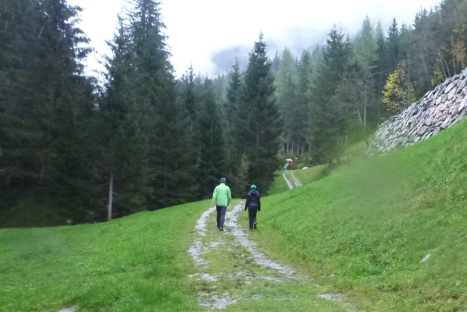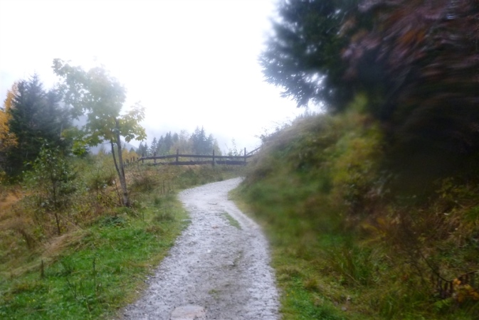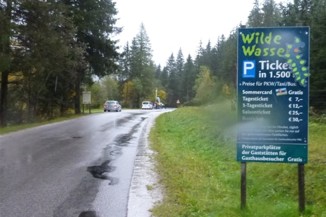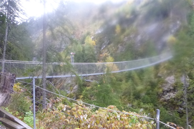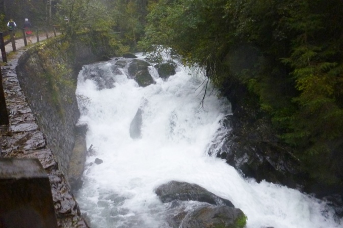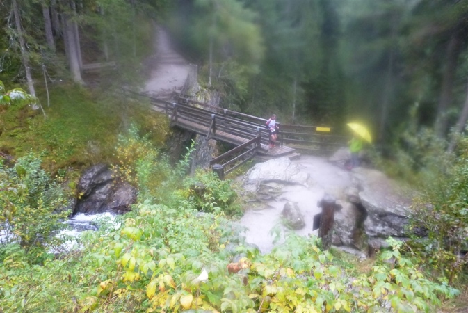 Vorne wird gerast, als wäre der Leibhaftige hinter ihnen her, hinten geht es gewohnt deutlich gemütlicher zur Sache. Noch in Schladming geht es leicht bergauf, dann kommt der Einstieg in den Wilde Wasser Weg und wir biegen in die Talbachklamm ein. Auf breitem Schotterweg kommen wir, stetig bergauf und parallel des reißenden Talbachs, gut voran. Schon bald passiert das, was ich unbedingt vermeiden wollte, aber unmöglich vermeiden kann: Die Kamera inkl. Linse wird nass, ich habe nichts Trockenes mehr zum Abwischen dabei, entsprechend ist die Qualität der Bilder. Es regnet weiter ohne Unterlass.