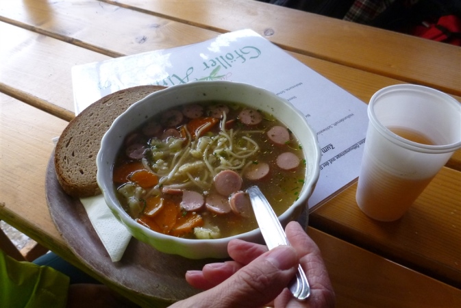 Im Ziel gibt es eine tolle, reichhaltige und abwechslungsreiche Zielverpflegung, dann entschwinde ich in den rückwärtigen Bereich der Hütte, der üblicherweise wohl als Lagerraum genutzt wird. Hier kann ich mich im Dunst der Abgase eines Stromaggregats umziehen, die am Schladminger Hauptplatz abgegebene Wechselkleidung steht bereits parat. Egal, Hauptsache es ist warm und trocken. Und dann gibt’s sogar noch eine leckere Suppe auf Veranstalterkosten, die wir u.a. im extra aufgestellten Zelt einnehmen können. Das ist wirklich nicht von schlechten Eltern. Und als ich sehe, welch schönes „Fresspaket“ die jeweils ersten drei Frauen und Männer erhalten, werde ich ob der offensichtlich großzügigen Sponsoren fast schon etwas neidisch. Als auch ich im Rahmen einer Verlosung noch ein paar Flaschen lokalen Bieres in die Hand gedrückt bekomme, bin ich restlos beeindruckt. Gerne schleppe ich die über die zweieinhalb km über einen alternativ zur Höll verlaufenden Forstweg zu Tal, wo unser Auto steht.