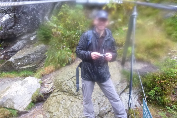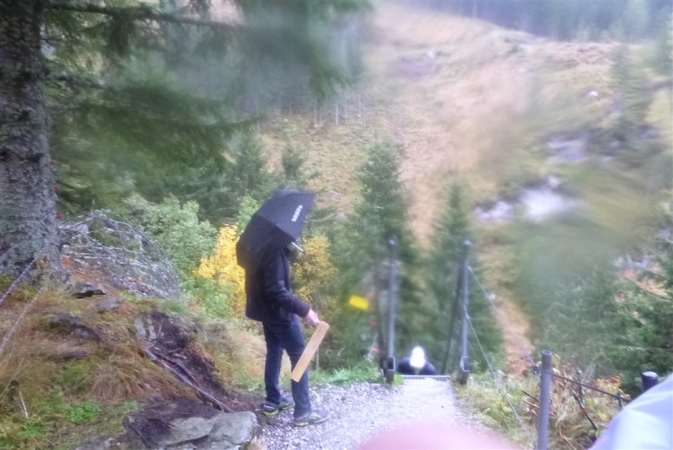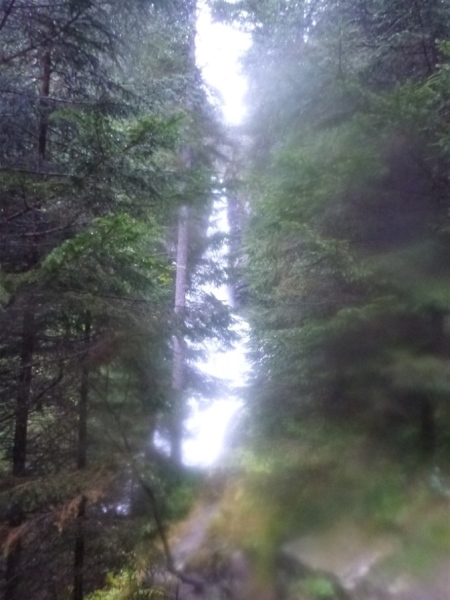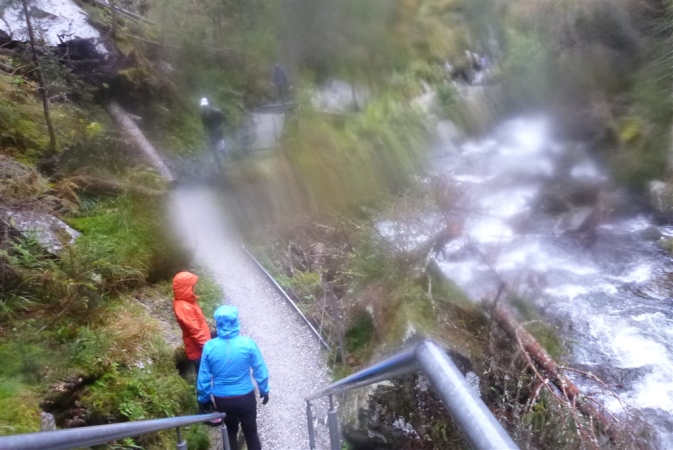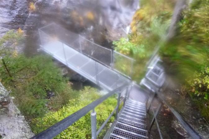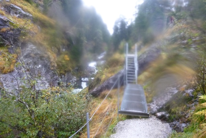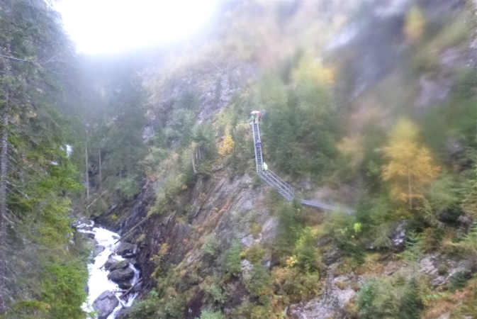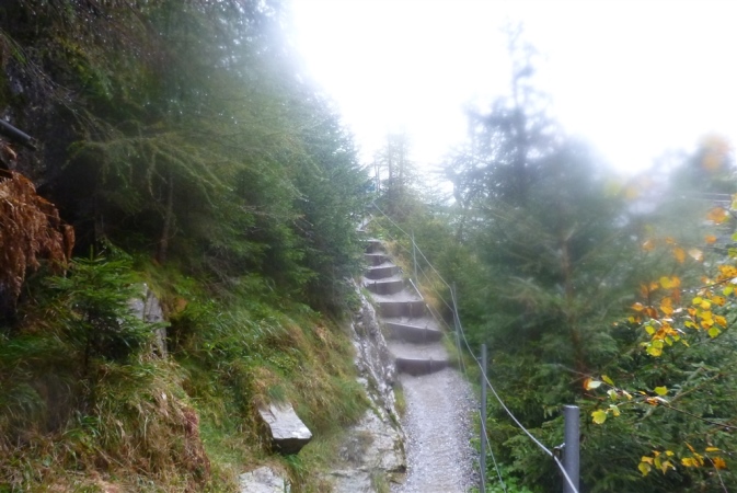 Haben sich die ersten dreihundert Höhenmeter auf zwölf km verteilt, kommen die zweiten geballt auf deren knapp zwei. Im ständigen Wechsel zwischen mit dicken Holzbalken gesicherten Naturstufen mit ständig wechselnden Höhen und verschiedenen Stahltreppen und -leitern kommt wohl auch der stärkste Läufer an seine Grenzen. Obwohl – ein Kilian Jornet fliegt wahrscheinlich auch hier hinauf. Und auch hinunter, denn teilweise folgen auch Abschnitte steilst bergab. Wehe dem, der hier zu schnell macht und stolpert! Immer wieder schaue ich vor und zurück, selbst bei diesem Schietwetter ist es unglaublich, was einem hier geboten wird. Ob es so etwas nochmal woanders gibt?