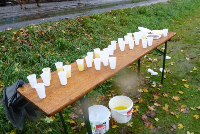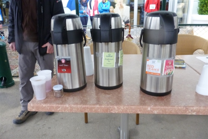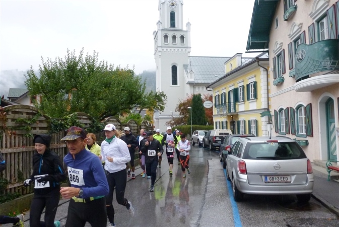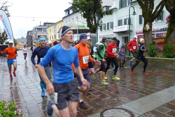 Der Start findet um exakt 9:09 Uhr am Hauptplatz statt, offensichtlich will man Kollisionen mit den Kirchgängern um 9 Uhr vermeiden. Hier gibt es auch die Startnummern, unmittelbar vor dem Start, dann erst wird auch gezahlt. Sehr gerne genommen wird der erste heiße Tee, der angesichts von höchstens sechs Grad zur Freude zahlreicher Teilnehmer schon angeboten wird. Selbstauferlegten Stress brauche ich heute keinen, daher gibt es keine persönliche Zeitvorgabe, die ohnehin niemandem nützt. Ich reihe mich ziemlich hinten ein und harre der Dinge, die da kommen mögen.