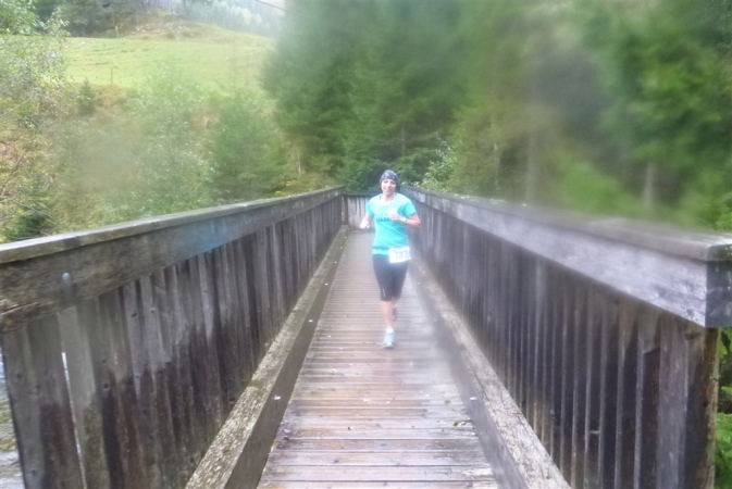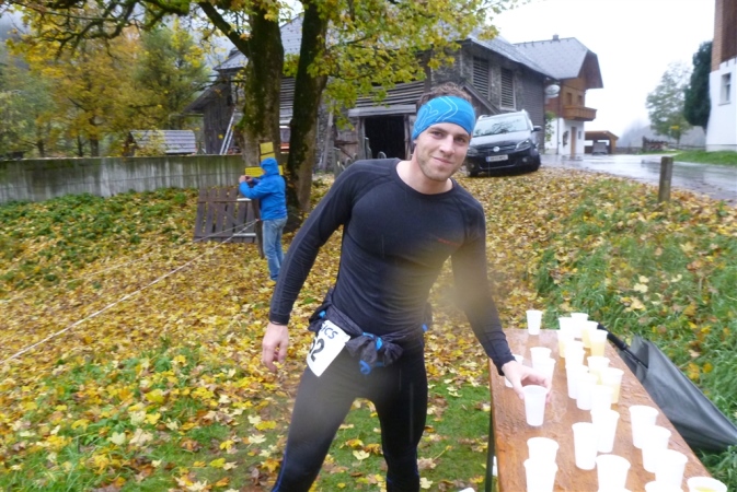 Die Untergründe wechseln ständig hin und her zwischen Sand, Asphalt, Holzbrücken und teilweise Naturboden. Natürlich sind die Füße längst nass geworden, die wasserfesten Schuhe liegen gut zuhause. Die erste von zwei Labestellen kommt bei etwa km 6,5, es gibt Iso, Wasser, Bananen und Schokolade. Der gute Mensch vor Ort sorgt nicht nur für Nachschub, sondern auch für das erste Heldenfoto, das man mir freundlicherweise neben einigen anderen direkt nach dem Lauf zuschickt. Vorteil des Reporters!