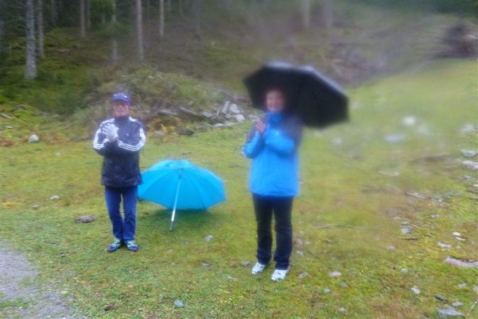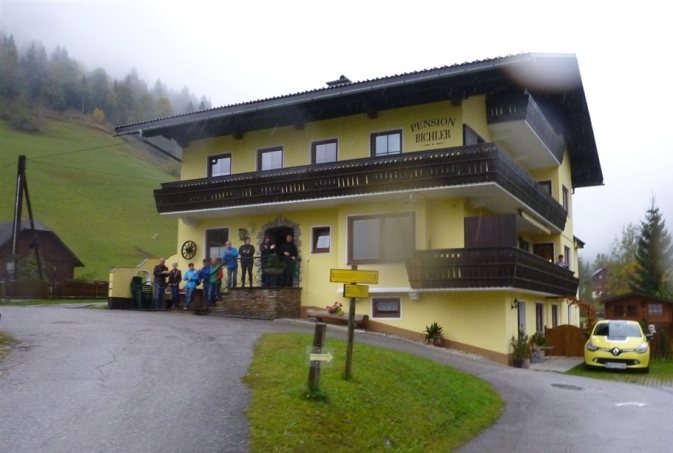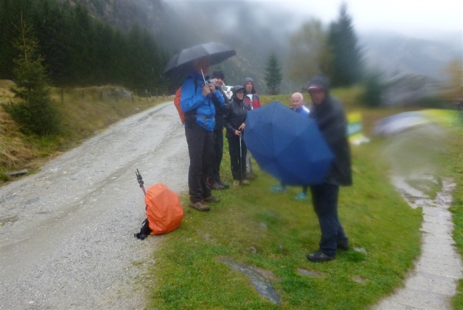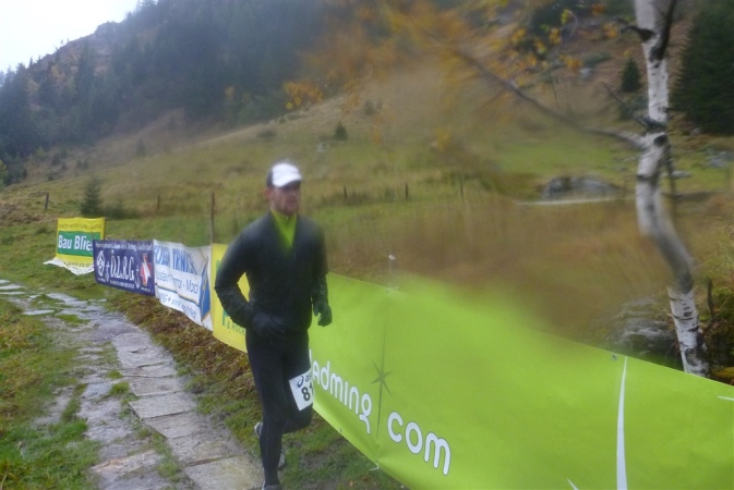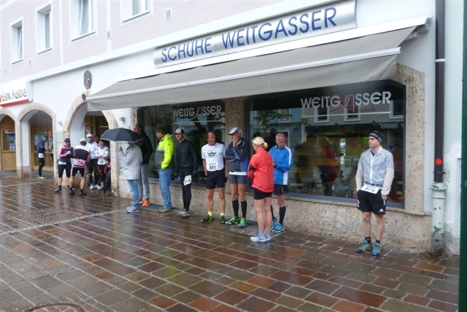 Nach 81 Männlein und Weiblein 2014 machen sich heuer 62 Personen (78 waren vorangemeldet, drei meldeten nach) auf, die Bergwelt zu erobern. Die Schladminger Läufer pflegen eine Partnerschaft mit dem Team Naunheim aus Wetzlar, der Schladminger Partnerstadt, daher sind heute wieder etliche Hessebebbel, nämlich neun, am Start zzgl. Fanclub. Leider erleben auch die kein besseres Wetter als ich: Eine schwere Nebelwolke liegt über uns, seit gestern regnet es Bindfäden. Das trübt zwar nicht meine Laune, aber die Sicht und dementsprechend die Fotoausbeute lassen deutlich zu wünschen übrig.