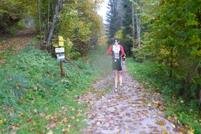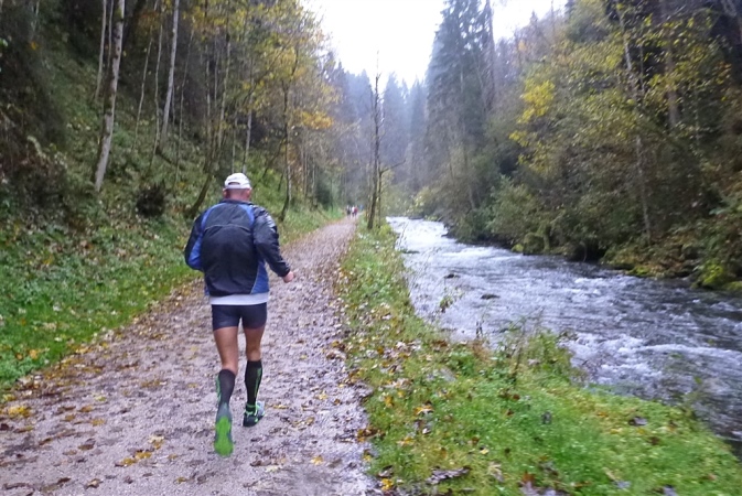 Vorbei an der Mautstation (für unsere Begleitungen gab es heute erfreulicherweise einen Freifahrtschein) laufen wir öfter parallel zur Fahrbahn auf einem Wirtschaftsweg, und nach dem Almgasthaus Waldhäusel mit Teich gelangen wir schließlich nach ziemlich genau 12 km zum letzten Parkplatz. Hier verpflegen uns nette Mädels ein zweites Mal. Was danach folgt, ist die Hölle. Genau genommen die Höll, also der „Alpinsteig durch die Höll“. Und genau der ist es, der aus diesem Lauf etwas ganz Besonderes macht, denn die letzten beiden km sind Horror und größtes Vergnügen zugleich. Ganz abhängig davon, ob Du Dich vorher verausgabt, oder wie der Autor die Strecke vernünftig eingeteilt hast.
