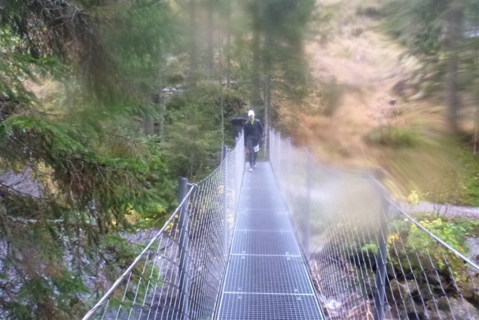 Begleitet von der parallel verlaufenden Riesach, der in zwei Stufen über 140 m lautstark zu Tal stürzt, geht es immer höher über Stiegen, Treppen und kleine Felsabschnitte weiter und plötzlich kommt dann der Oberhammer: Eine 50 m lange Hängebrücke aus Stahlseilen, über die ich schwankend die andere Seite erreiche, an der eine weitere gute Seele unvergleichliche Fotos schießt. Weitere Treppen, kurze Wegabschnitte und Stiegen folgen bergauf, dann liegt sie vor mir und ich weiß, dass es endlich geschafft ist: Die Gfölleralm auf 1.338 m Höhe. Aber auch ich bin geschafft. Mit meinen 1:32 Std. finde ich mich gar nicht so langsam, um dann zu erfahren, dass der Sieger stolze 30 Minuten eher oben war und damit einen neuen Streckenrekord aufgestellt hat.