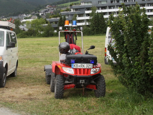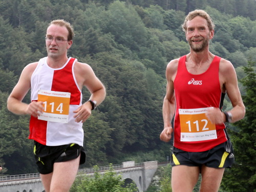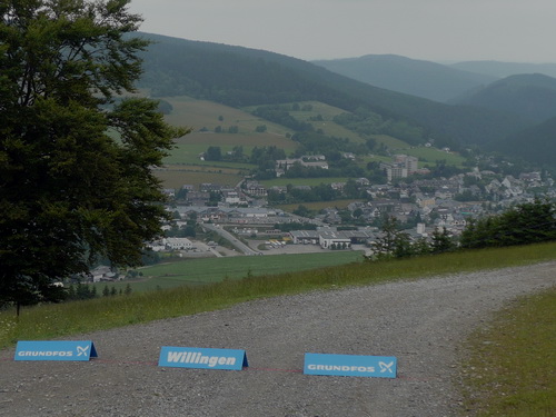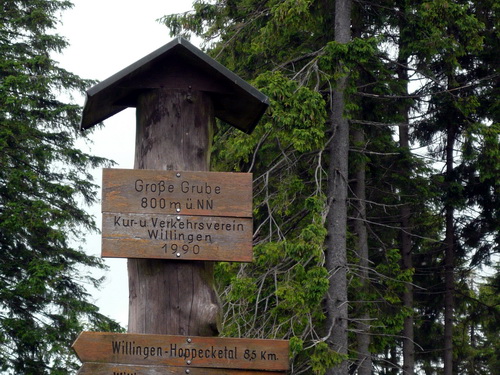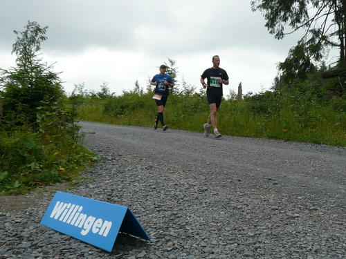 Bei der Großen Grube (798 m, km 33) wartet eine schwere Prüfung. Es ist eine 4 km lange Schleife um und auf den Ettelsberg zu laufen. Vier, fünf Marathonis kommen uns entgegen. Der Gedanke, sich ihnen anzuschließen, kann da schon aufkommen. Aber Paul passt auf, dass sich keiner von uns „verläuft“. Unser nächstes Zwischenziel liegt oben, der Weg führt uns aber abwärts. Mist. Erst an der Kehre auf dem Skihang geht es nach einem Blick auf Willingen mit deutlicher Steigung weiter.