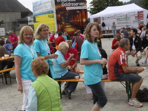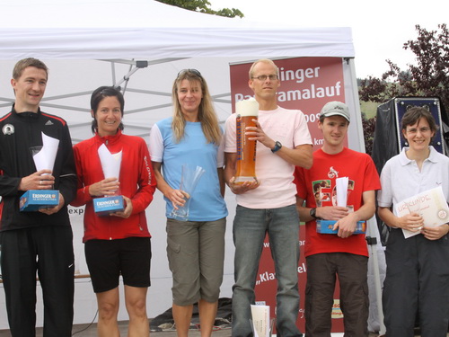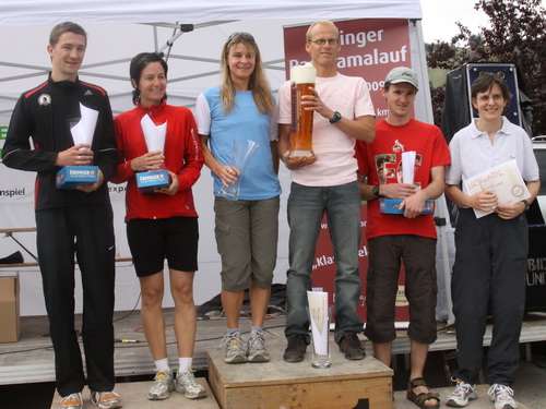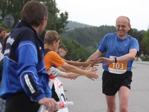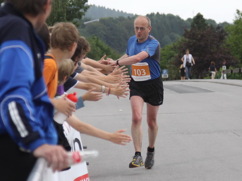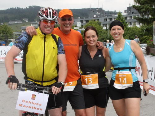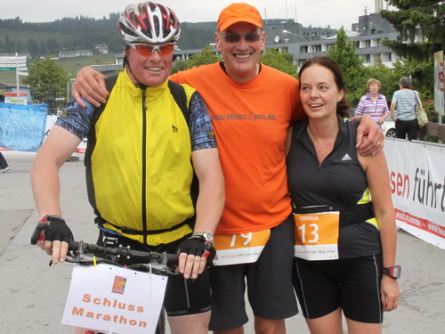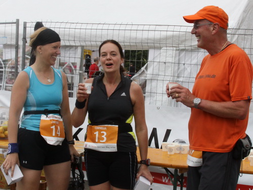 Km 39, km 40, im Eiltempo erreiche ich die Hinweistafeln. Dann eine Spaßbremse in Form einer kurzen Rampe und ich kann den Abstand verringern. Der Rest ist schnell erzählt. Cornelia läuft knapp unter 5 Stunden ins Ziel, ich dicht dahinter. Der Sprecher und die Zeitnehmer freuen sich gemeinsam, denn jetzt ist Feierabend.