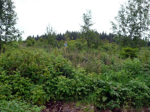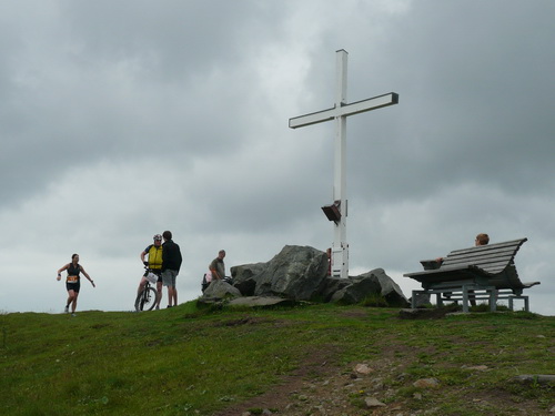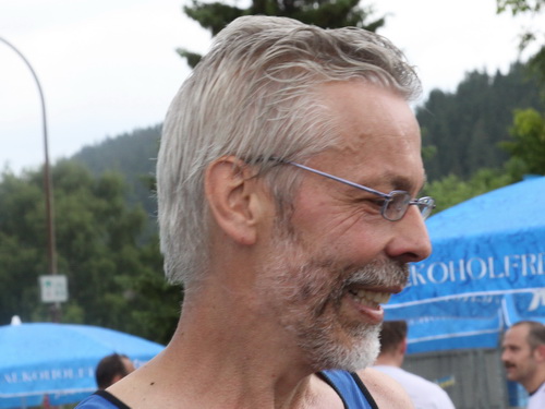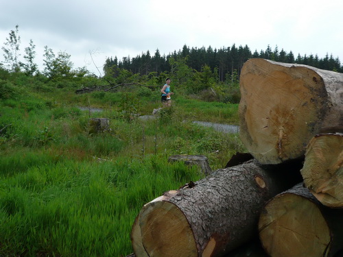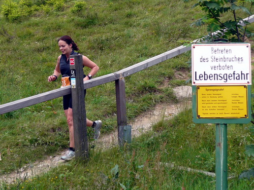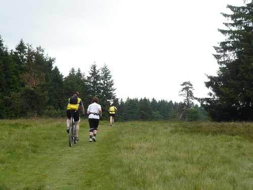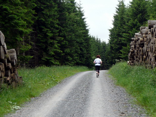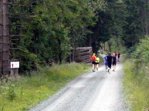 Der Weg durch den dichten Fichtenwald ist breit und gut zu laufen. Cornelia ist 30 Meter vor mir, der Biker hinter oder neben mir. Ich freue mich, dass es so gut läuft. Mein bester Lauf seit meinem Comeback, und dann Letzter. Da, Cornelia fasst sich an den Oberschenkel. Ein Krampf? Nein, wohl nur eine lästige Mücke, sie läuft weiter. Ich lasse meinen Foto stecken, außer Bäumen gibt es jetzt sowieso nichts zu sehen. Ich bleibe dran, kann aber keinen Boden gut machen. Ich will sie ja nicht überholen, gönne ihr den Zweitletzten. Ich möchte nur nicht abgeschlagen im Ziel eintrudeln.
