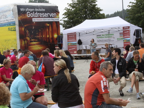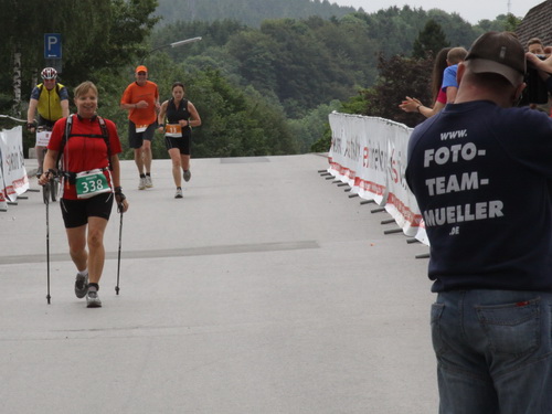 Bei km 18 kommen von rechts die 33 km- und Halbmarathonläufer und sorgen kurzzeitig für etwas Belebung. Später treffen wir auch auf ein paar Walker, über die Achim Achilles ja bereits alles gesagt hat. Ich habe dem nichts hinzuzufügen. Cornelia, Paul und ich bilden schon die ganze Zeit ein Team, das unterschiedlicher nicht sein kann. Paul ist mit seinem Bike ja sowieso außer Konkurrenz und während ich die Berge ganz gut hoch komme, lässt Cornelia da etwas nach. Dafür halte ich mich auf flachen und vor allem abschüssigen Wegen etwas zurück und sie gibt mächtig Gas. Bei Verpflegungs- und Aussichtspunkten treffen wir dann immer wieder zusammen.