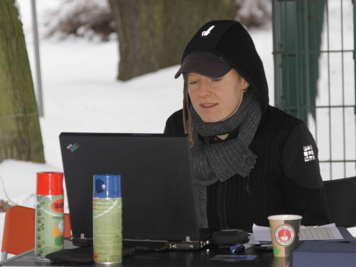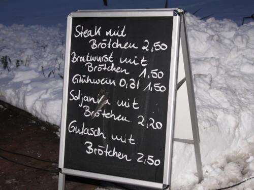 Auch die Strecke wird insgesamt nicht schlechter. Die Helfer leisten ganze Arbeit. Nur zum Klatschen stellen sie die Schaufel mal kurz ab. Die Imbissbude bei der Rennbahn ist inzwischen auch gut frequentiert und ich überlege mir tatsächlich, auch in eine echte Thüringer zu investieren. Aber der Griller lässt sich auf kein Kreditgeschäft ein.
