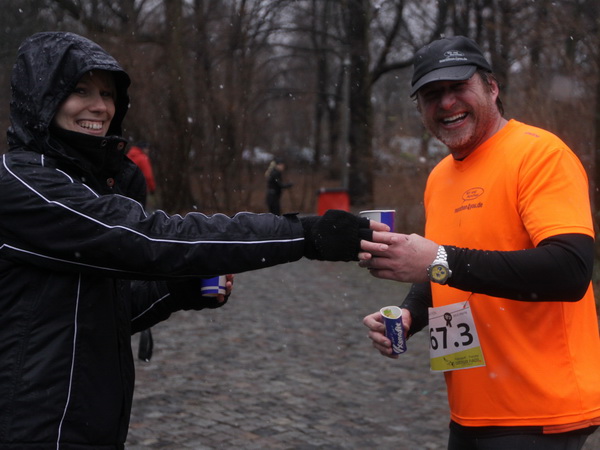 Mit jeder Runde ändert der Niederschlag seinen Aggregatzustand mehr, zudem hat die bisher gefallene Menge, im Verbund mit den vielen Füßen, die ihn in den permanent in Untergrund einarbeiten, zu ausgedehnten Pfützen geführt. Stellenweise bieten die Streckenposten den außerordentlichen Service, den Boden zu kehren und das Wasser der Pfützen ins Gras zu befördern. Meine müden Beine schaffen es anderenorts aber nicht auszuweichen. Was soll’s. An nassen Füßen wird es nicht scheitern.