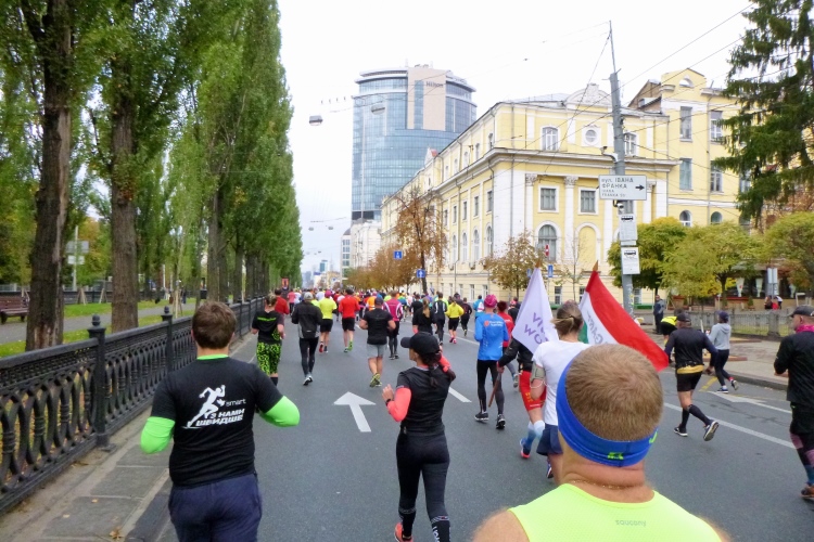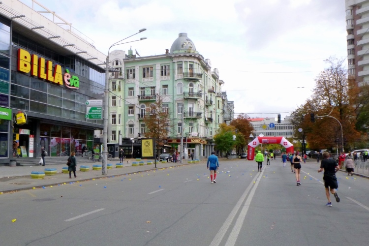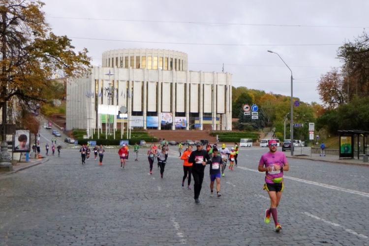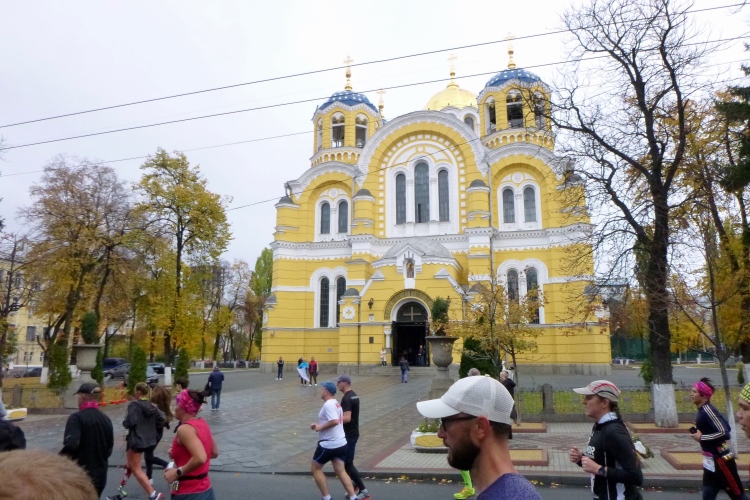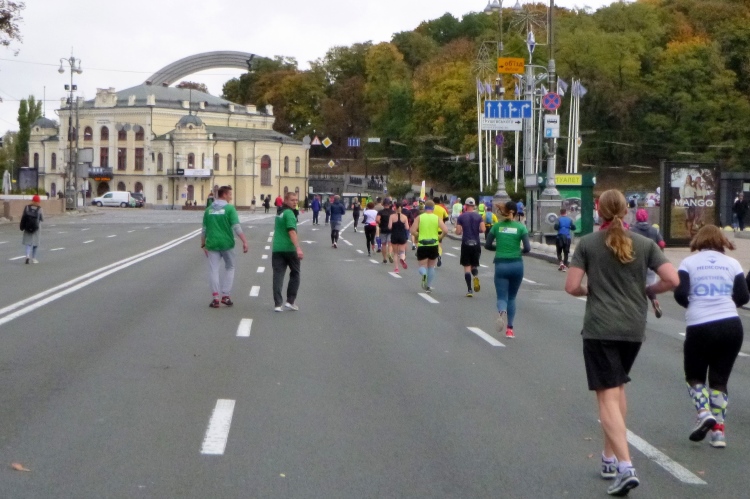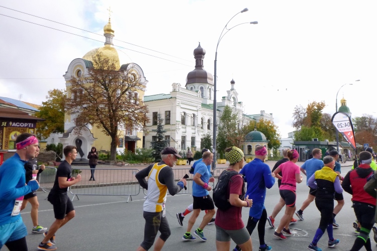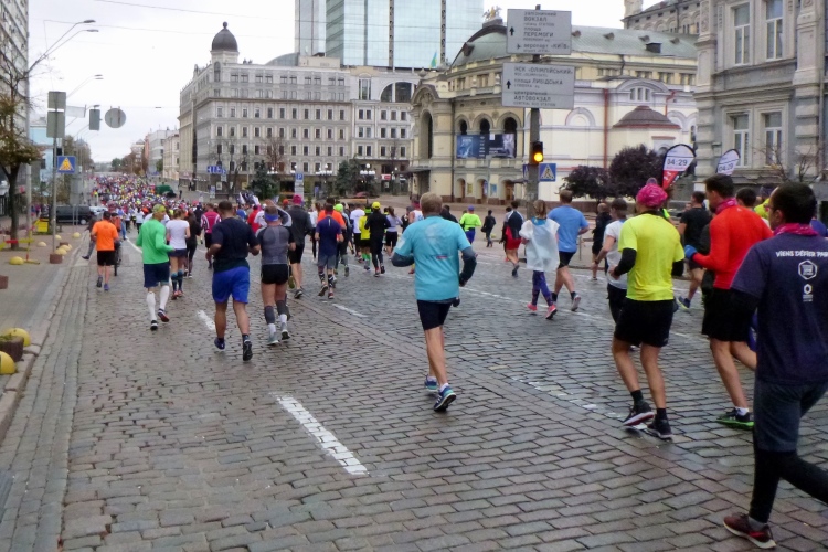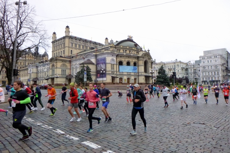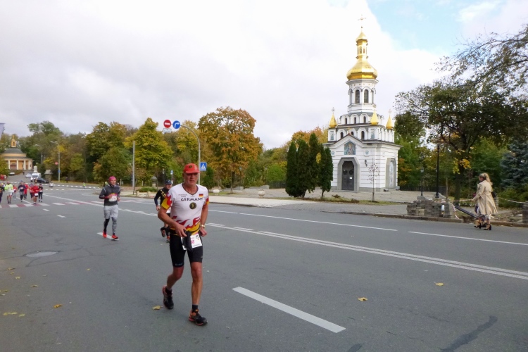 Anhand der Nationalflaggen auf der Startnummer kann man feststellen, dass die weltweite Aufmerksamkeit für den zum 10. Mal stattfindenden Marathon größer geworden ist. Die ukrainische Nationalhymne wird gespielt und dann geht es los. Auf den ersten acht Kilometern steht eine Sightseeing-Runde an. Sie beginn mit dem Goldenen Tor, dem größten der vier Kiewer Stadttore, das mit der Goldkuppelkirche „Mariä Verkündigung“ eine Einheit bildet. Das sieht man an der rechten Seite, wenn man bei Kilometer eins schon Zeit dafür hat. Platz ist genug da, aber das Kopfsteinpflaster verlangt viel Aufmerksamkeit. Das Nationale Opernhaus der Ukraine ist nicht zu übersehen. Dann links drei Ukrainische Nationalmuseen, die sich mit verschiedenen Themenbereichen der Geschichte beschäftigen. Es geht bergab über den Taras-Shevchenko-Boulevard, benannt nach dem ukrainischen Nationaldichter und Freiheitskämpfer, der im 19. Jahrhundert lebte. An der Wladimirkathedrale vorbei. Dem Großfürsten Wladimir (960 bis 1015) ist die Einführung des Christentums in der Kiewer Region zu verdanken. Spannend, wie abwechslungsreich die Bebauung ist. Alt, sozialistisch, kapitalistisch – alles ist vorhanden, auch wenn das vielleicht jetzt keine korrekte Baustilbeschreibung ist.