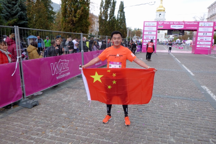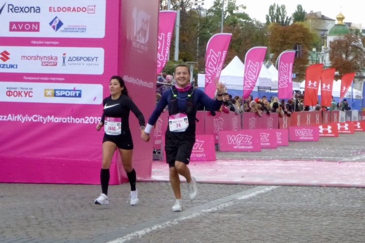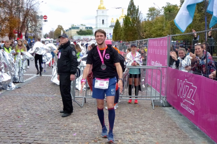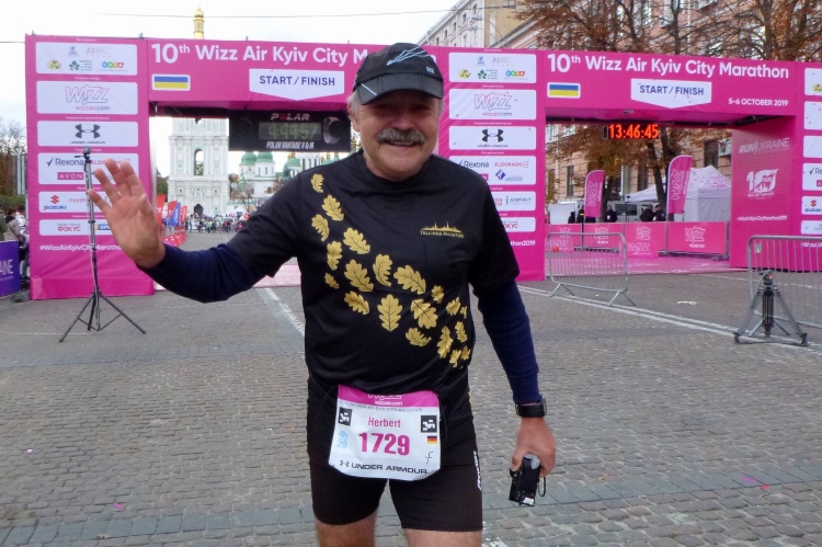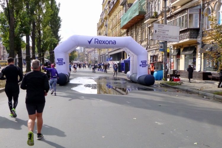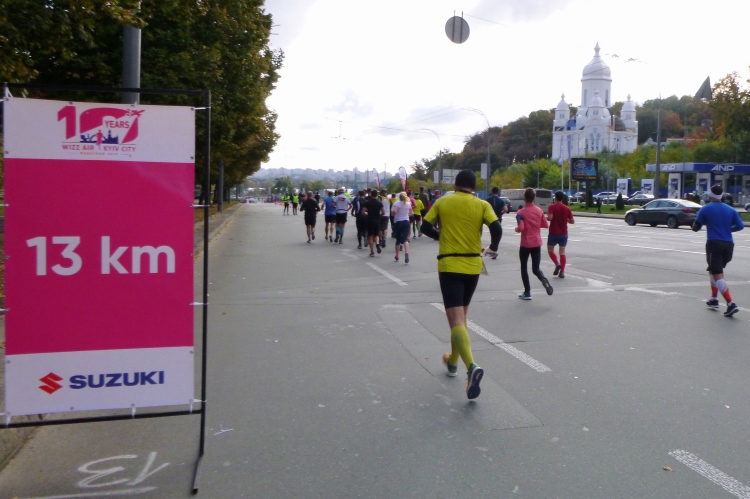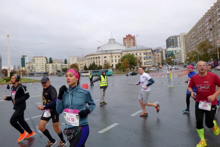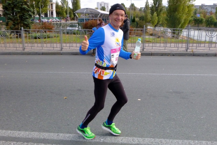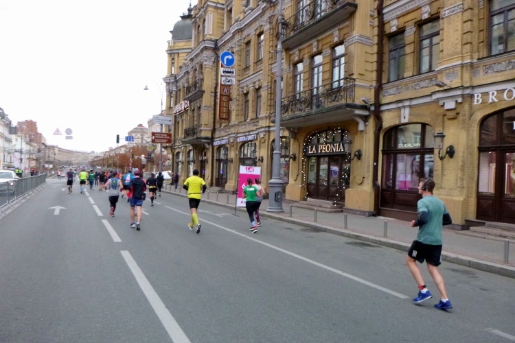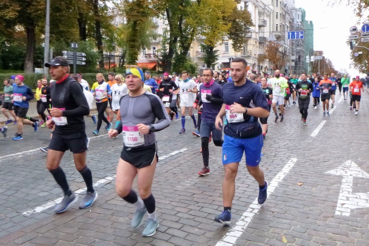 Anhand der Nationalflaggen auf der Startnummer kann man feststellen, dass die weltweite Aufmerksamkeit für den zum 10. Mal stattfindenden Marathon größer geworden ist. Die ukrainische Nationalhymne wird gespielt und dann geht es los. Auf den ersten acht Kilometern steht eine Sightseeing-Runde an. Sie beginn mit dem Goldenen Tor, dem größten der vier Kiewer Stadttore, das mit der Goldkuppelkirche „Mariä Verkündigung“ eine Einheit bildet. Das sieht man an der rechten Seite, wenn man bei Kilometer eins schon Zeit dafür hat. Platz ist genug da, aber das Kopfsteinpflaster verlangt viel Aufmerksamkeit. Das Nationale Opernhaus der Ukraine ist nicht zu übersehen. Dann links drei Ukrainische Nationalmuseen, die sich mit verschiedenen Themenbereichen der Geschichte beschäftigen. Es geht bergab über den Taras-Shevchenko-Boulevard, benannt nach dem ukrainischen Nationaldichter und Freiheitskämpfer, der im 19. Jahrhundert lebte. An der Wladimirkathedrale vorbei. Dem Großfürsten Wladimir (960 bis 1015) ist die Einführung des Christentums in der Kiewer Region zu verdanken. Spannend, wie abwechslungsreich die Bebauung ist. Alt, sozialistisch, kapitalistisch – alles ist vorhanden, auch wenn das vielleicht jetzt keine korrekte Baustilbeschreibung ist.