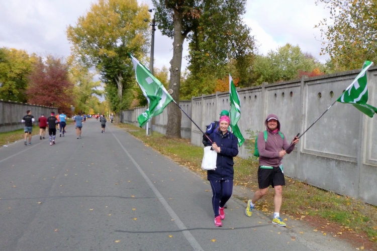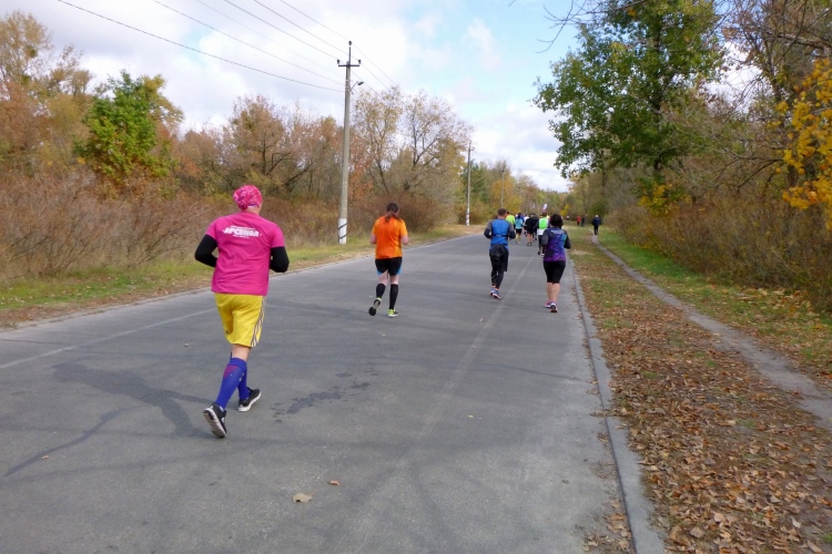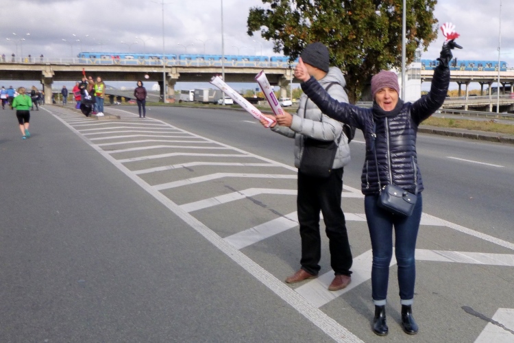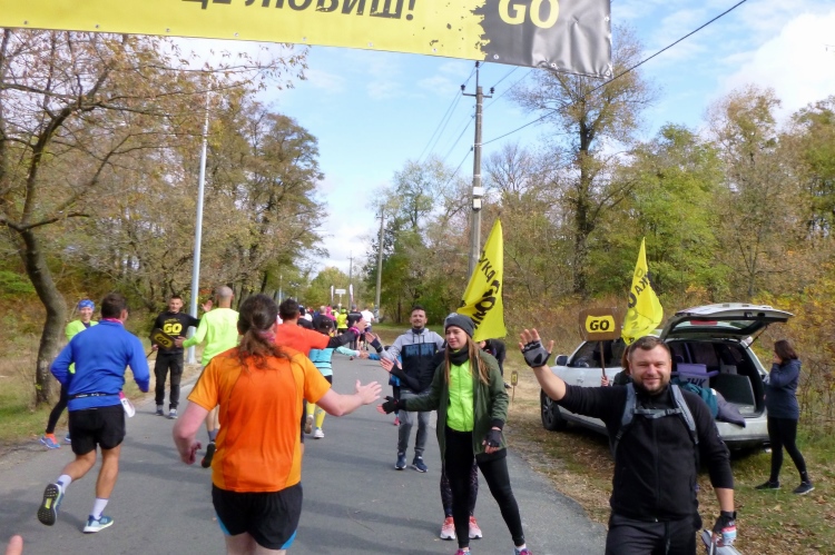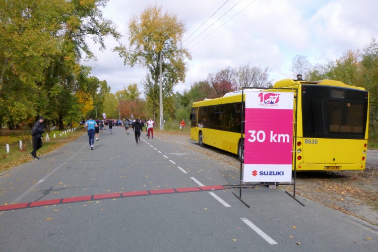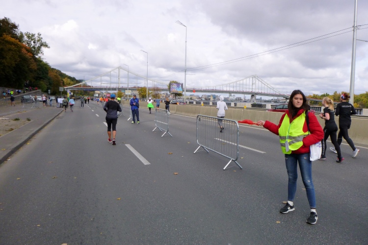 Nach fast fünf Kilometern mal Abwechslung: Über die Parkovy-Hängebrücke, die uns auf eine Dnepr-Insel bringen wird. Fünf „grüne“ Kilometer warten auf uns. Kiefernwälder an den Seiten. Sogar einige Zuschauer. Hier fällt mir auch auf, dass die medizinische Versorgung sehr gut ist. Oft sieht man Zweierteams von Rettungssanitätern. Und viele Marathonis sind auch noch unterwegs. Bei über 2.000 Finishern ist man auch weiter hinten nicht allein. Leider kommen nun die 4:29-Pacer und überholen mich. Ich genieße den angenehmen Geruch der Bäume. Bei Kilometer 30 dann Staffelwechsel, Zeitnahme, Musik und wieder ein guter Verpflegungsstand. Wasser, Iso, Cola, Orangenscheiben und Bananen gibt es oft. Angereicht von vielen Helferinnen und Helfern. Sobald sie mein Fähnchen auf der Startnummer sehen, wird die Ansage auf „water“ umgestellt. Die VPs stehen alle drei Kilometer. Toilettenhäuschen gibt es dort auch mehrere.