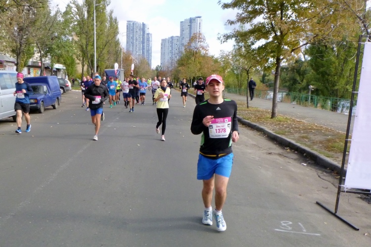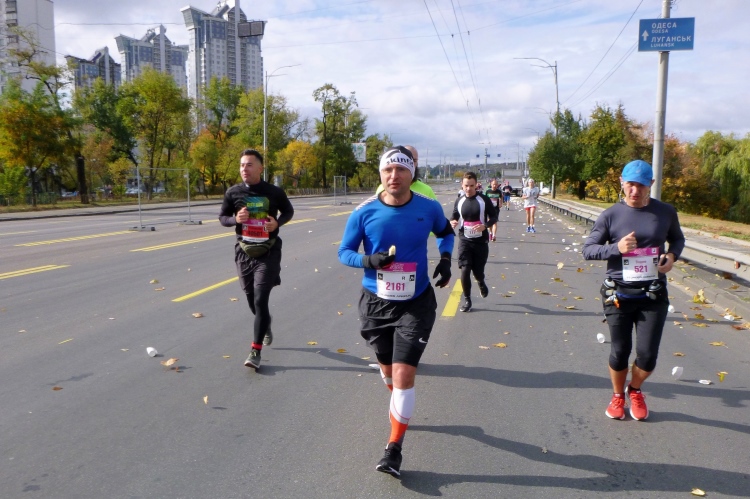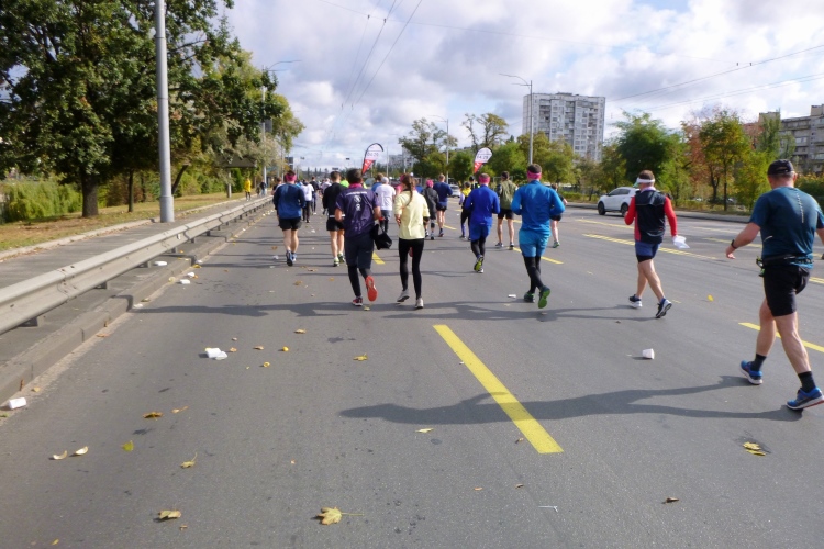 Auf der anderen Seite umrunden wir einen Kanal. Ich versuche Judith zu entdecken. Aber die ist wohl zu weit voraus. Riesige Wohnhochhäuser rechts. Wende und auf der anderen Seite des Kanals zurück. Der umschließt die dreieckige Insel Rusanivka. Die Häuserblöcke hier sind älter, urbaner könnte man höflich sagen. Einige Passanten schauen uninteressiert zu. Die kommen über eine Fußgängerbrücke vom Berezniaky-Markt. Ich frage den deutschen Läufer Thomas neben mir, ob er die Geschwindigkeit der 4:29-Stunden-Pacer nicht auch als zu hoch empfindet. Wir haben einen Kilometerschnitt von fast 6:00 Minuten. Zustimmung. Das flotte Tempo könnte daran liegen, dass uns noch ein paar Höhenmeter bevorstehen, für die ein Zeitpolster herausgelaufen werden soll.