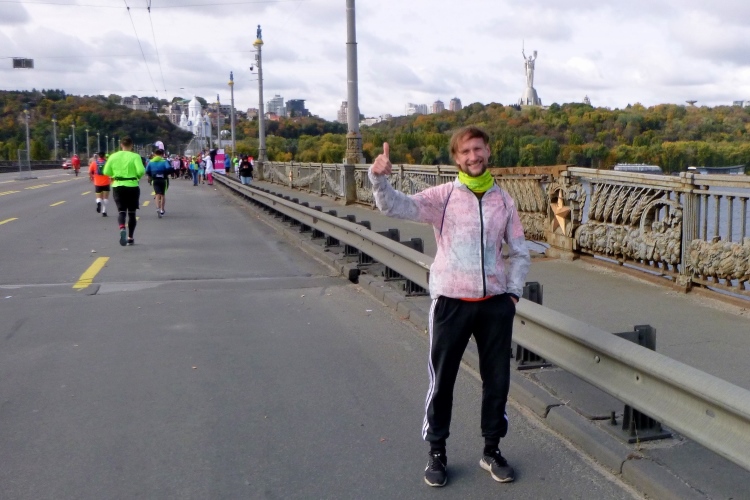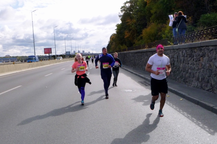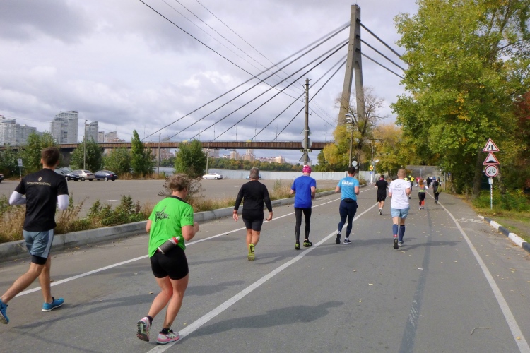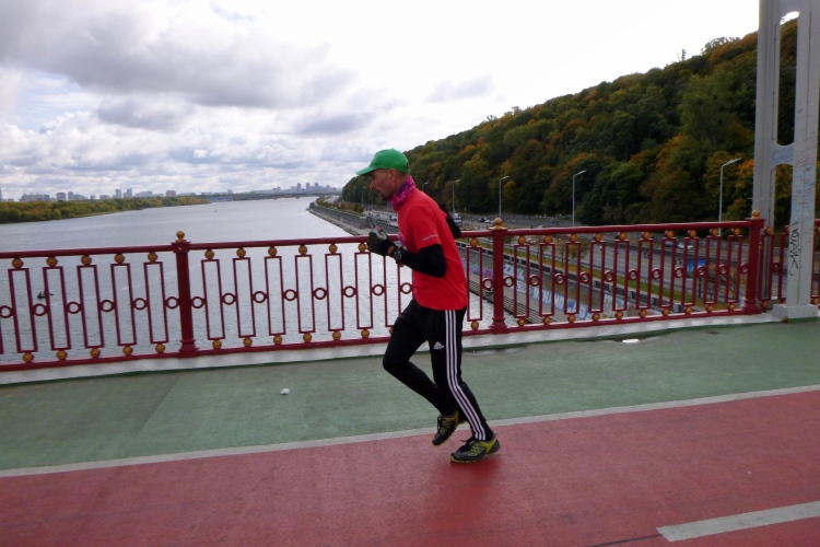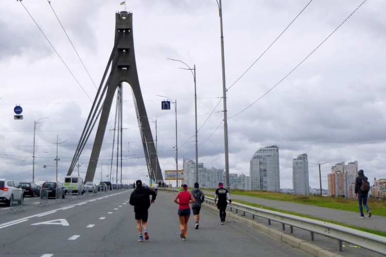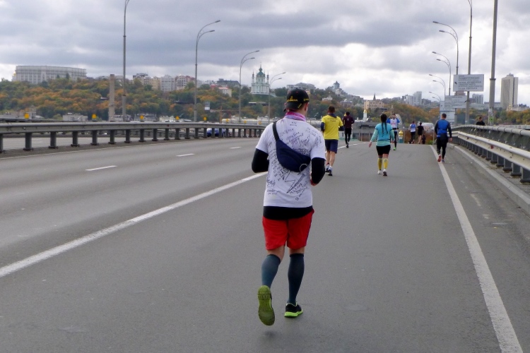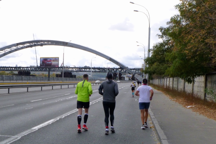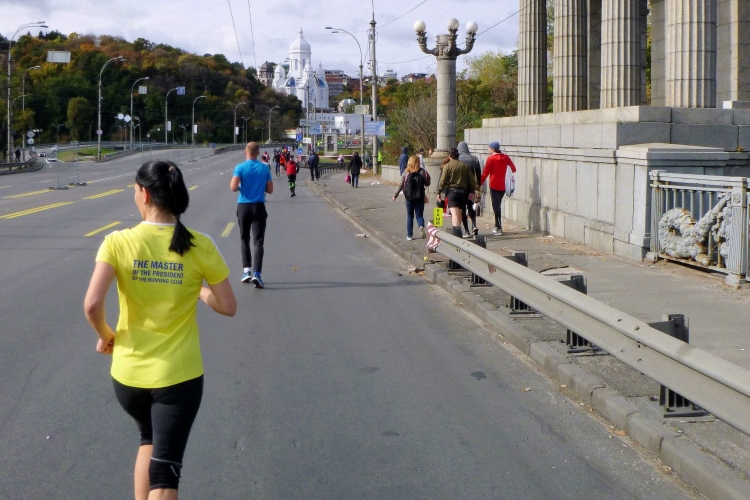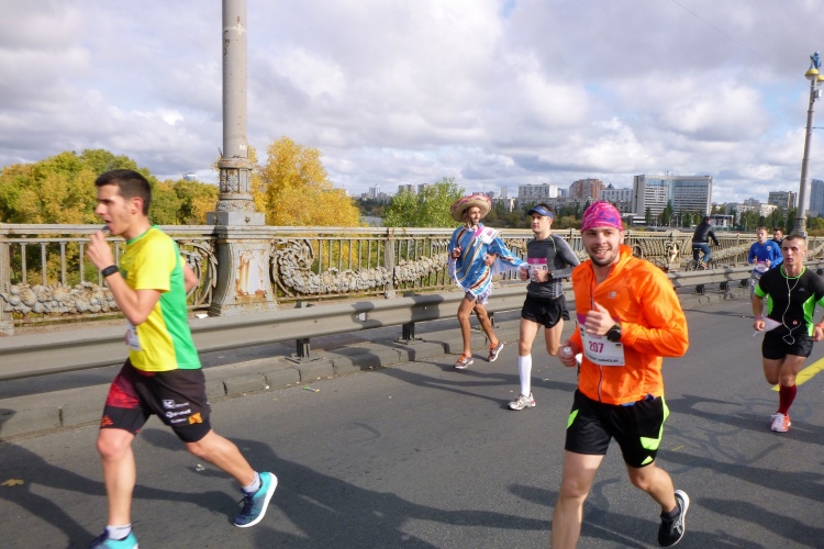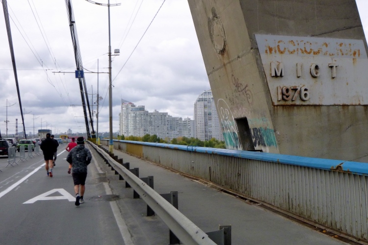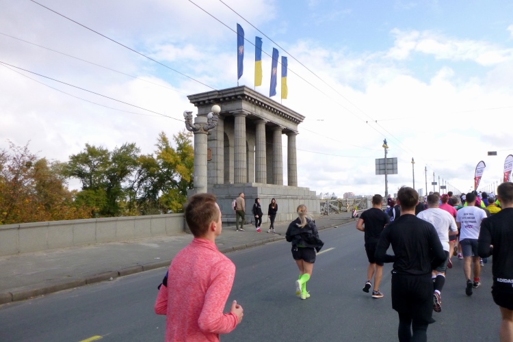 Zurück zum Marathon. Für uns geht es hinunter zur Panton-Brücke, eine Schleife auf der anderen Dnepr-Seite steht an. Die Führenden kommen uns entgegen, sie haben bereits 20 km hinter sich, wir erst 14. Die Brücke ist einseitig gesperrt und 1.543 Meter lang. Die erste geschweißte Stahlbalkenbrücke weltweit wurde vom Ingenieur Panton von 1941 bis 1953 gebaut. Der verrostete Bau benötigt sicher bald mal eine Sanierung. Ob der Länge fühle ich mich etwas an den Venedig-Marathon erinnert.