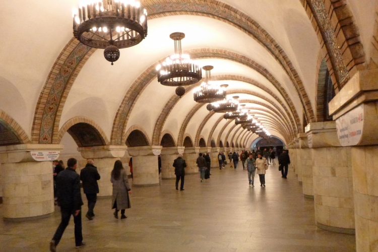 Nun aber mal was Sportliches: Die Startunterlagen gibt es dieses Jahr im Expo-Gelände weit draußen vor der Stadt. Aber auch dorthin führt die Metro. Kiew war die dritte Stadt in der ehemaligen Sowjetunion, die eine U-Bahn bekam. Die Stationen befinden sich sehr tief unter der Erde. „Arsenalna“ soll mit 105 Metern die weltweit tiefste Metro-Haltestelle sein. Dies liegt einerseits an dem schwierigen Untergrund aus feuchtem Sand, andererseits an dem Wunsch, die Stationen auch als Bunker nutzen zu können, und nicht zuletzt an den sieben Hügeln, auf denen Kiew – wie auch Rom - gebaut wurde. So liegt die auf Arsenalna folgende Station dann schon auf der Dnepr-Brücke ohne dass es merklich nach oben ging. Die Haltestellen selbst sind meist Dreiröhren-Stationen mit einer hübsch gestalteten Mittelröhre. Die Rolltreppen sind ewig lang, bis zu 65 Metern, und das Personal verströmt einen sehr sozialistischen Charme. Hier gibt es noch Diensttelefone aus den frühen siebziger Jahren. Für die Fahrt zahlt man 8 Hrywnja, umgerechnet 0,30 Euro. Die dafür notwendigen Plastikmünzen kauft man am Schalter, genau eine pro Person und nicht etwa mehrere auf Vorrat. Wechselgeld ist ausreichend vorhanden. Nach den Mehrfach-Chipkarten, die auf Plakaten angeboten werden, fragen wir vergeblich. Bald stelle ich aber fest, dass man direkt an der Schranke mit berührungslosen Kreditkarten oder sogar der Smartuhr mit Kreditkartenapp bezahlen kann. Der Geheimdienst besitzt dann auch gleich ein Bewegungsprotokoll.