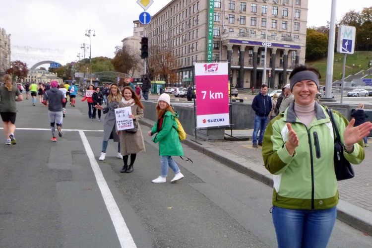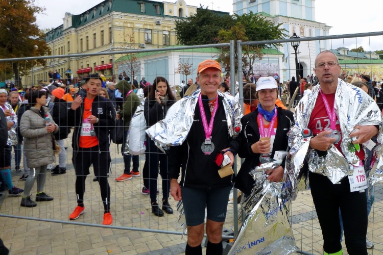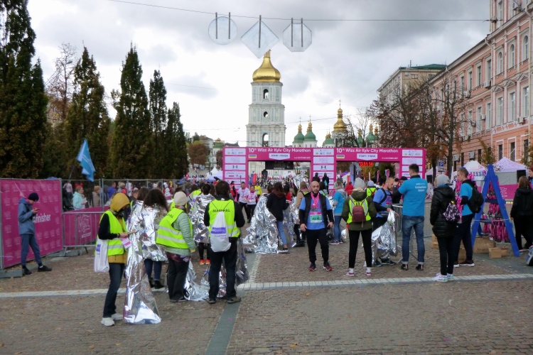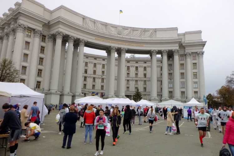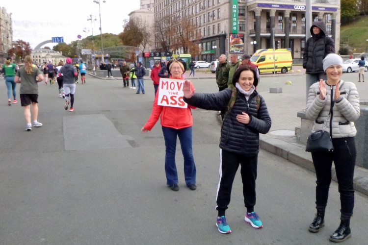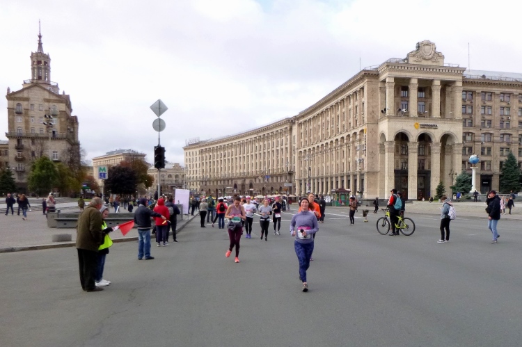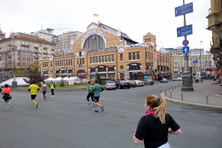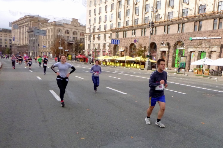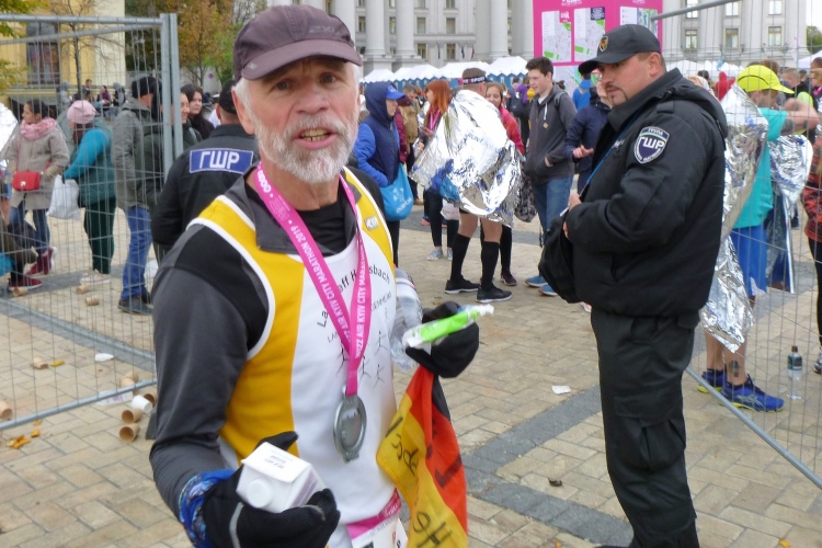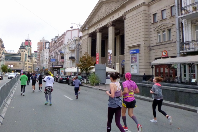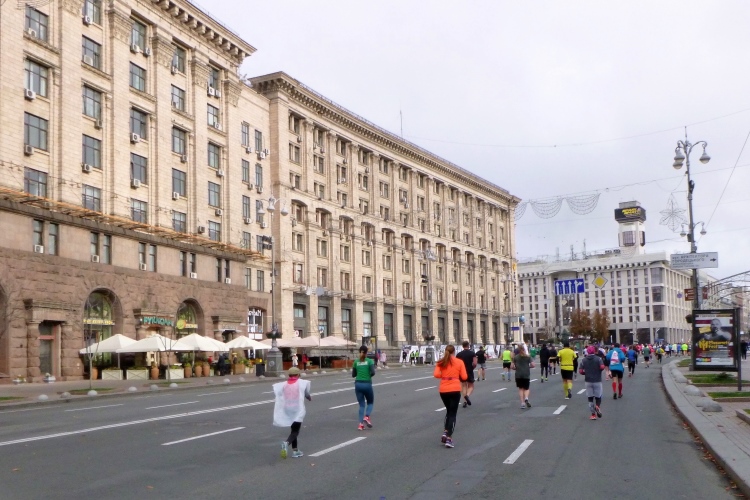 Ich komme mit Kathrin und Peter aus Leipzig ins Gespräch. Leipzig (seit 1961) ist wie München (seit 1981) eine Partnerstadt von Kiew. Sogar die deutsche Botschafterin hatte sich zum Start angekündigt. Dann hätte aber auch der Bürgermeister und Boxchampion emeritus Vitali Klitschko vorbei kommen müssen. Peter meint, er laufe heute seinen ersten Marathon im „Ostblock“. Ich muss ein bisschen darüber nachdenken. In unserer Jugend, wir sind gleich alt, begann für mich der Ostblock hinter dem Fichtelgebirge. Auch in Jugoslawien war ich mal. Aber ohne Marathon. Warschau, Budapest? Ist ja nun EU. Viele Ukrainer wollen ebenfalls in die EU, was vor sechs Jahren zur heute „Euromajdan“ genannten Revolution führe.