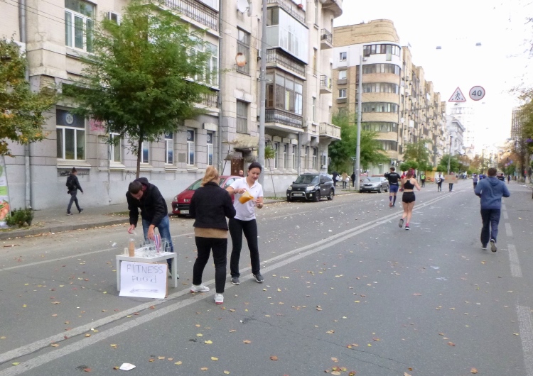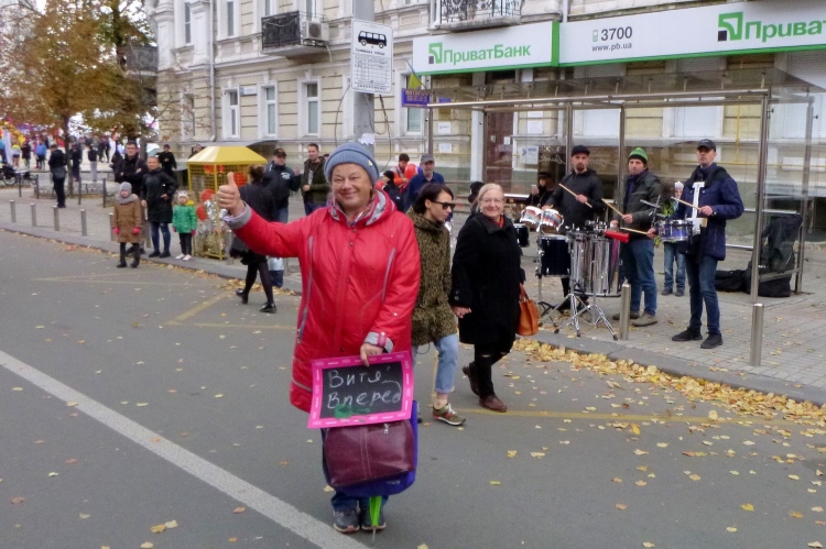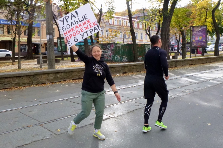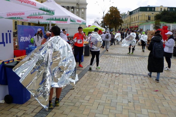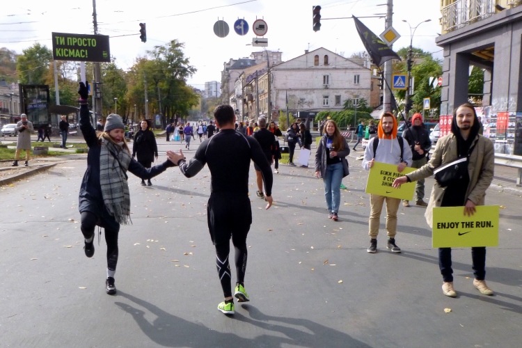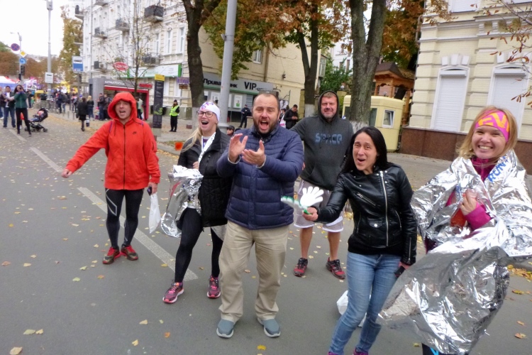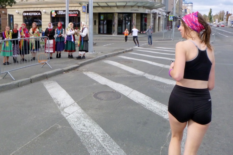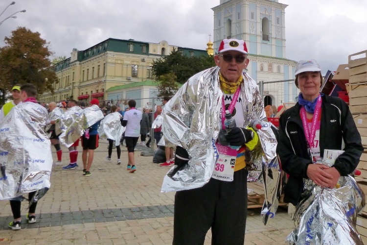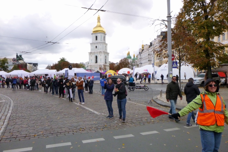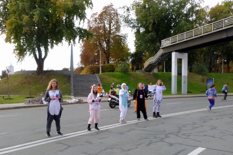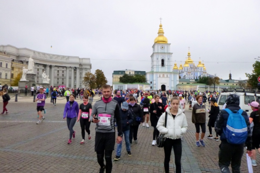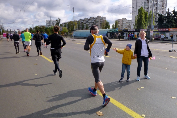Ich komme mit Kathrin und Peter aus Leipzig ins Gespräch. Leipzig (seit 1961) ist wie München (seit 1981) eine Partnerstadt von Kiew. Sogar die deutsche Botschafterin hatte sich zum Start angekündigt. Dann hätte aber auch der Bürgermeister und Boxchampion emeritus Vitali Klitschko vorbei kommen müssen. Peter meint, er laufe heute seinen ersten Marathon im „Ostblock“. Ich muss ein bisschen darüber nachdenken. In unserer Jugend, wir sind gleich alt, begann für mich der Ostblock hinter dem Fichtelgebirge. Auch in Jugoslawien war ich mal. Aber ohne Marathon. Warschau, Budapest? Ist ja nun EU. Viele Ukrainer wollen ebenfalls in die EU, was vor sechs Jahren zur heute „Euromajdan“ genannten Revolution führe.