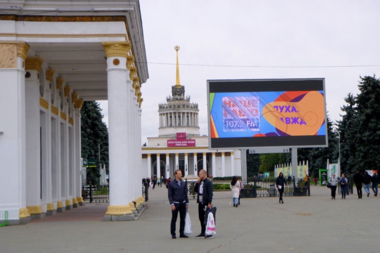 Die Station „Vystavkovyi tsentr“ liegt an der Expo. Wie oft inmitten eines kleinen Markt- und Shopping-Bereichs. Eine breite Straße ist per Ampel zu queren, eine weitere per Unterführung. Von denen gibt es unzählige in der Stadt. Oft auch mit kleinem beheiztem Einkaufszentrum. Aber wer braucht heute eine Heizung? Die Außentemperatur beträgt 25 Grad und man versteht, warum hier viele Häuser Klimaanlagen besitzen. Im Sommer sind langanhaltenden Hitzeperioden keine Seltenheit.