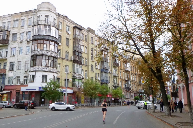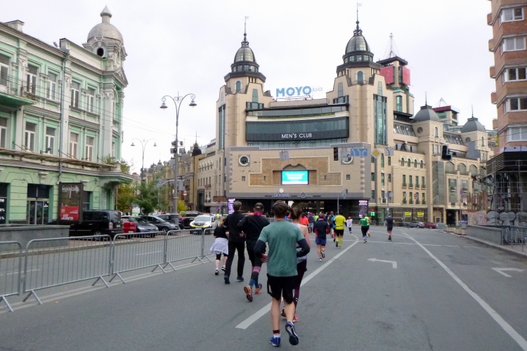 Aktuell habe ich keinen Hunger, freue mich über die vielen Zuschauer. Oft werde ich mit Namen angefeuert. Rechts hinter dem Torbogen findet man Shops der internationalen Designer-Elite. Und das Restaurant „Chicken Kyiv“ mit den hübschesten jungen Damen und Herren der Stadt. Das namensgebende Gericht samt Bier gibt es für 6 €. High heels sind als Outfit nicht zwingend vorgeschrieben. Touristinnen in M4Y-Jacken und Laufschuhen dürfen auch hinein.