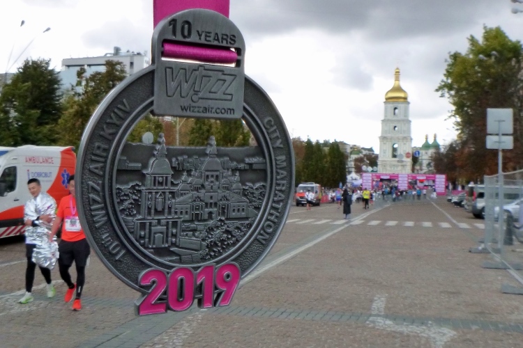 Die Medaille ist groß und schwer und kann es auf ihre Art mit den Kolossen am Streckenrand aufnehmen. Judith wartet auf mich. Sie ist Zweite der Altersklasse und darf sich über ein Preisgeld von 1.200 Hrywnja freuen. Von den Frankfurter Laufkollegen belegte Manuela Platz 1 in ihrer AK und ist wahrscheinlich mit Herbert (4. Platz) schon auf dem Weg zum Flughafen.