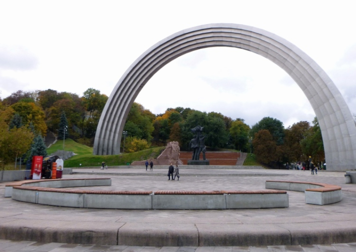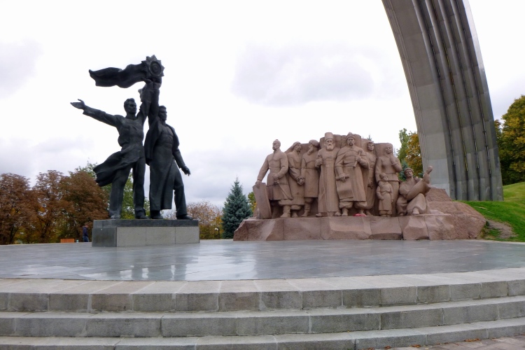 Der Freitag steht ganz im Zeichen der Stadtbesichtigung. Etliche der markanten Gebäude und Skulpturen werden wir auch während des Laufs zu sehen bekommen. Interessant ist der Ausflug zum Denkmal der Völkerfreundschaft. Auch aus großer Entfernung gut sichtbar ist der Titan-Bogen mit 60 m Durchmesser. Darunter thront eine riesige Bronzeskulptur mit zwei Figuren, einem russischen und einem ukrainischen Arbeiter, die in 6,20 m Höhe das Band des sowjetischen Ordens der Völkerfreundschaft schwenken. Daneben symbolisiert ein Granitdenkmal den Vertrag von Perejaslaw. Dieser Treueeid aus dem Jahr 1654 gilt als eines der wichtigsten Ereignisse in der Geschichte der russisch-ukrainischen Beziehungen. Die Akteure sind allesamt mit verbissenem Gesichtsausdruck dargestellt. Anscheinend ein Wesenszug der Männer dieser Region. Da fühle ich mich gleich in meinem Element und schaue ebenfalls finster drein. Aber unser Reiseführer hebt hervor, dass die ukrainischen Männer inzwischen auch öfter mal lächeln. Fertiggestellt wurden die Denkmäler zur 1500-Jahrfeier Kiews anno 1982. Dass es kurz darauf mit der viel beschworenen Freundschaft nicht mehr ganz so weit her sein sollte, ahnte wohl damals niemand.