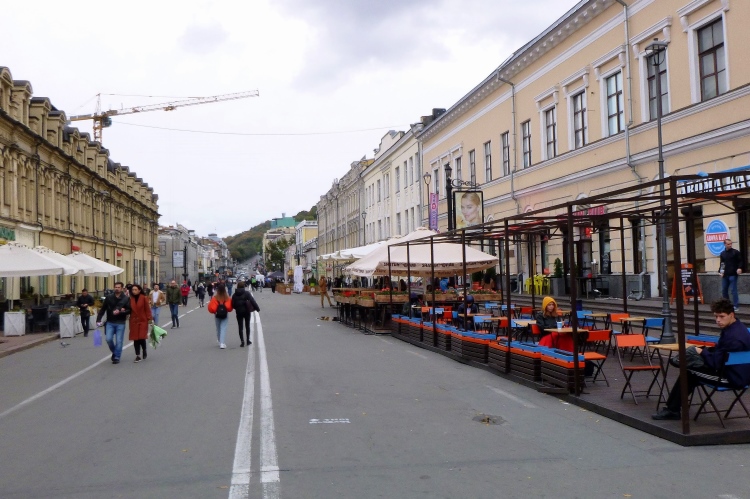 Rechts an der Bessarabsky-Markthalle vorbei. Links davon liegt das Restaurant „Varenychna Katyusha". Im Ambiente eines russischen Wohnzimmers gibt es günstige ukrainische Spezialitäten, beispielsweise Borschtsch oder verschiedene Arten gefüllter Teigtaschen. Wir bezahlen mit Vorspeise, Getränken und Nachtisch zu zweit oft weniger als 20 €. Noch günstiger sind die Selbstbedienungsrestaurants. Da muss man allerdings auf die gewünschten Gerichte deuten, denn die Beschriftung ist nur in Ukrainisch, selbstredend mit kyrillischen Buchstaben. Nebenan das „Roshen“, das zum Imperium des ehemaligen Präsidenten Petro Poroschenko gehört. Ein Eldorado für Freunde von Schokolade und Süßwaren mit mehreren Filialen in der Hauptstadt.